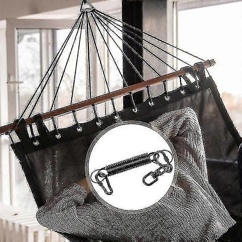 Beskrivning Tillverkad av stabilt jrn och rostfritt stl, denna kraftiga fjder r lmplig fr att hnga upp hngstolar och andra hngande tillbehr som sandsckar, hngande vxter, etc. Den fsts skert p din gungstol och lter dig vrida dig utan att trassla ihop sig. Funktioner - Frg: svart - Material: jrn, rostfritt stl - Storlek (fjder): 27,50X3,50X3,50cm / 10,81X1,38X1,38 tum - Storlek (karbinhake): 8,00X4,00X0,60cm / 3,14X1, 57X0. 24 tum - Mtt (svngring): 9,00X3,50X0,60cm/3,54X1,38X0,24 tum - Mer flexibel och allmnt anvnd, kan hngas p andra tunga freml som hngs p den upphjda ramen. - Svngfjdergruppen r mycket stabil, och fjdrarna kan hoppa med amplituden, svnga eller rotera bekvmt, s att mnniskokroppen kan slappna av. -Du kan hnga hngmattor och stolar vldigt skert och enkelt, och hngringarna r snabba och enkla fr sker faststtning. - Lmplig fr verandagungor, lampor, hngstolar, markiser, sandsckar, gungstolar, utomhusgungor, etc. - Tillverkad av material av jrn och rostfritt stl, hllbart och ltt att bra. Packlista 1 x svngfjder