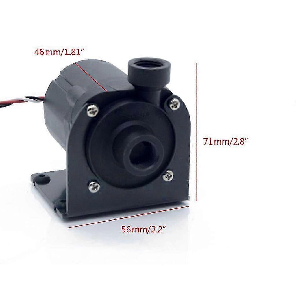 "Feature:\nThis product has good power, high tightness and water leakage prevention.\nThis is a computer water-cooled power system,With water pump bracket for easy installation,to facilitate your choice of assembly difficulties.\n\nA: Without bracket, \nB: With bracket,\nC: External power supply 12V 5A (can be connected to the fan at the same for time)\n\nSpecification:\nModel: PU-SC600\nName: Brushless for DC water pump\nVoltage: 12V\nCurrent: 0.8A 10%\nSpeed: 5600RPM 5%\nHead: 4M 0.5M\nFlow rate: 600L/H10%\nThread: G1/4*2\nlength 71mm * width 49mm * height 58mm (without bracket)\nLength 71mm* width 56mm* height 66mm (with bracket)\n\nNote: The pump is not self-priming pump. It is strictly can not work without water. The inlet should be lower than the bottom of the water reservoir, and the water can automatically flow into the water inlet of the pump is ok.\nCeramic bearing, bushing, very quiet when working, no water idling during use\n\nPackage includes:\n1 x Pump\n1 x Bracket(only for the with bracket version)":