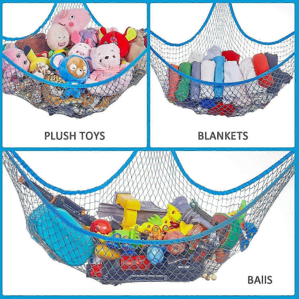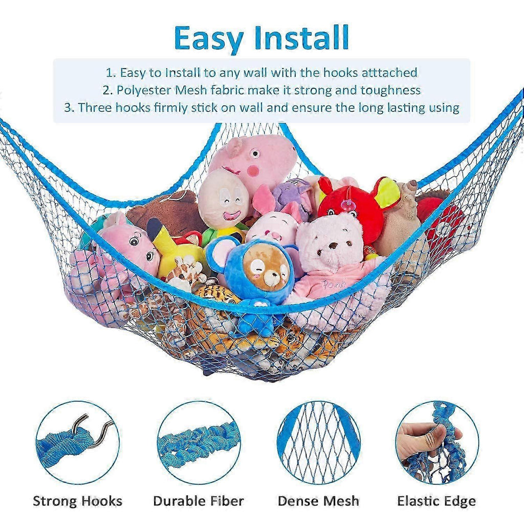 KIDS FAVORITE: This Toy Hammock for Stuffed Animals will be kids's favorite toy organizing tool, which can replace storage boxes and baskets; their toys are always available and within reach! HIGH-QUALITY MATERIALS: The hammock is made of polyester fiber woven mesh, and the elastic frame makes it very elastic and durable. LARGE SIZE: The stuffed animal hammock can extend up to 70*47*47 inches, which can accommodate many toys. EASY INSTALLATION: Our stuffed animal net is easy to install. We offer 3 drill hooks with anchors, you can choose this way you want to install.It is sturdy and durable. BEDROOM ESSENTIALS: Corner Net for Stuffed Animals for bedrooms and playrooms can keep your house tidy and beautiful. You will want to know how you and your child can manage without a toy hammock! You will not regret it! " Organize toys Great stuffed animal net! It can classify and storage plush toys, dolls, balls, blankets, clothing and other light items.