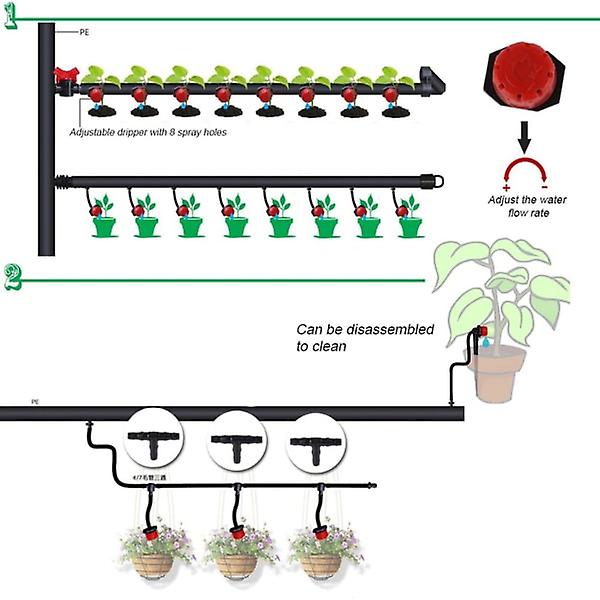 Product description: Colour: Black and red Material: Plastic Connections:< /b> 1/4" hose thread connector, 1/4" hose, for 4mm/7mm pipe (ID/OD). 360 degree adjustable: 8 nozzles that adjust the water flow and can also be used to interrupt the water flow. Ideal for watering potted plants, suitable for spray and drip irrigation in agriculture, lawns and gardens. When fully opened they cover a 10 to 12 inch circle. Rotating the lid allows for complete closure by adjusting the flow and throw diameter via a ratchet mechanism on the lid and notches on the base. Efficient water use: Can remain constant under long-term laying or pressure fluctuations, uniform irrigation and slow irrigation speed allow more complete water absorption of the soil in the root area of the plant. Product Features: When fully open, they cover a 10 to 12 inch circle, and by rotating The cap adjusts the flow and throw diameter until it is completely closed. Ideal for self-watering potted plants, agriculture, lawns, garden sprinklers and drip irrigation. Good sealing and long service life. It can remain constant under long-term laying or pressure fluctuations, fill water evenly, use water effectively and save water. Product specification attributes: Material: Plastic Size: 15*25cm Adjustable flow range: 1-70 l/h, working pressure: 1-3 kg Thread diameter: 1/4 inch, spray radius: 0- 0.5m Applicable to 4mm/7mm (inner diameter/outer diameter) pipes Package list: 100 drippers