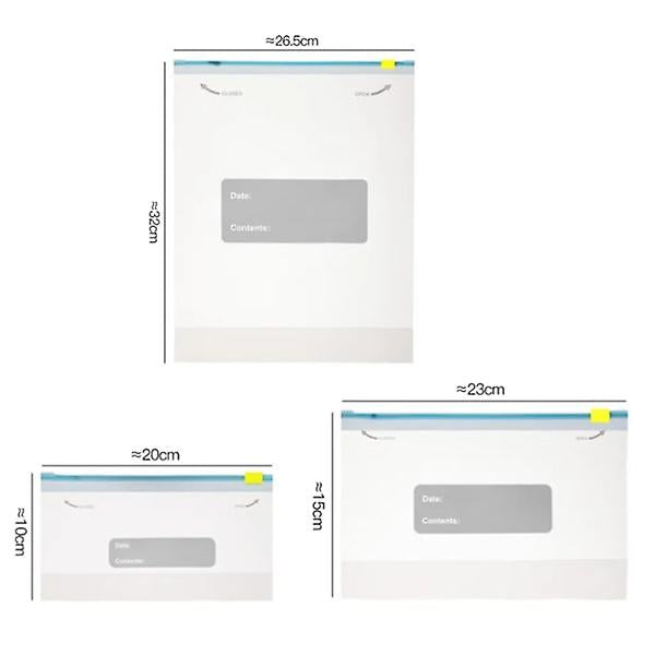 Product Description: Resealable Food Bag Set You will receive 15 zipper bags measuring 26.5 x 32 cm, 20 Zipper bags measuring 23 x 15 cm and 25 zipper bags measuring 26.5 x 32 cm for 20 x 10 cm zipper bags. There are 60 zipper bags in total, with enough quantity and different sizes to meet your different needs. Reliable Material Our reusable freezer bags are made of PE material, safe for direct food contact, BPA free, thick and durable. Zipper ClosureThis reusable food storage bag adopts a zipper slide closure design, which opens and closes smoothly and more conveniently, avoiding the traditional chain closure and creating an easy life . Way. Expandable BottomThe bottom of the zipper bag is widened, which increases the capacity of the bag and allows you to easily stand when the bag is full. Special Design This transparent durable plastic bag has a writable area in the middle, so you can easily mark food production date, item name and other information. Three different sizes of food bags allow you to store a variety of foods such as fruits, vegetables, nuts, sandwiches and more. Keep it tightly closed to prevent odor transfer. Product specification attributes: Dimensions:Small: Length x Width: 20cm x 10cm /7.87" x 3.94" (Approx.) Medium: Length x Width: 23 cm x 15 cm / 9.06" x 5.91" (Approx.) Large: Length x Width: 26.5cm x 32cm/10.43" x 12.6" (Approx.) Material: PE Color: Transparent Heat-resistant temperature: -60-100 Function: Sealing Features: Transparent, reusable, fresh Packing list: 25 *small size, 20*medium size, 15*large size Note: Due to differences in lighting and screen settings, the item's color may be slightly different from the picture. Please allow slight size differences due to different manual measurements.