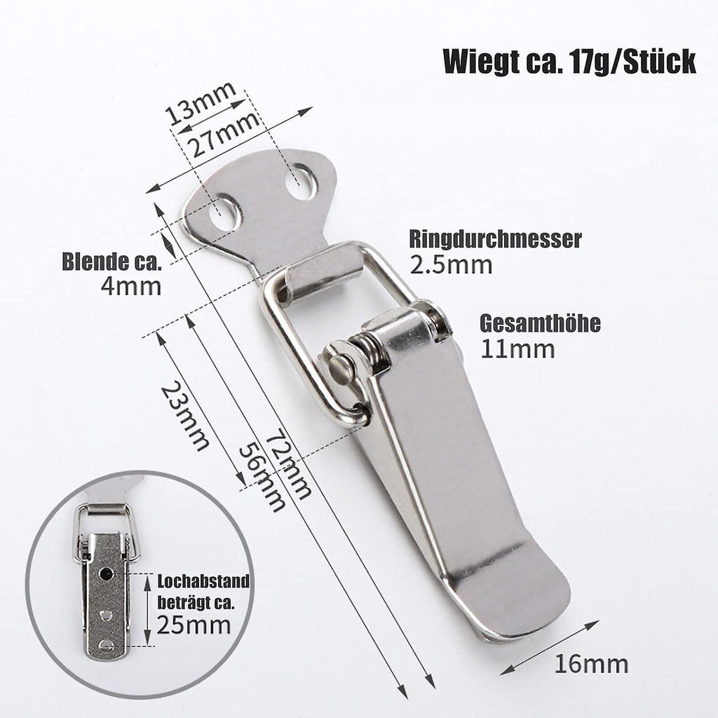 describe: [Included]: 4 pieces 56mm stainless steel snap fasteners, 16 pieces screws, enough for daily use and replacement. < p> [Appropriate size]: Each clip is about 56mm long and 16mm wide, which is suitable for most hardware. [HIGH QUALITY MATERIAL]: This stainless steel tension buckle is made of high quality metal, sturdy and durable, will not rust, easy to carry and will not break, can serve you for a long time. [WIDE APPLICATIONS ]: Silver buckle staples can be installed in boxes, boxes, suitcases, briefcases and also in good hardware such as drawers and wooden cabinets. use [Made of stainless steel]: Waterproof stainless steel, high quality spring, not easy to deform, durable, easy to install and store.