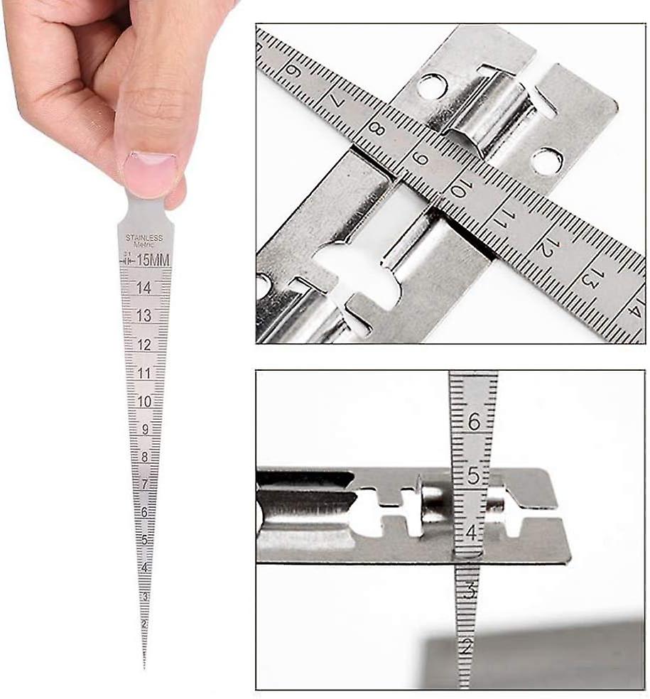 It is suitable for determining the internal diameter, measuring the aperture and measuring the clearance, for the diameters of small holes, slots, etc. The precise figures and increments are etched into the surface, easy to read. Metric and Stadard reading | Solder cone gauge: 1-15mm (1/64-5/8") Polished, bright and clean with no burrs, laser etched line rust and won't fade. The structure is simple and reasonable, easy to measure.Put the gauge on the gap or opening and read the measured value. Made of stainless steel, miniature and lightweight, easy to carry.