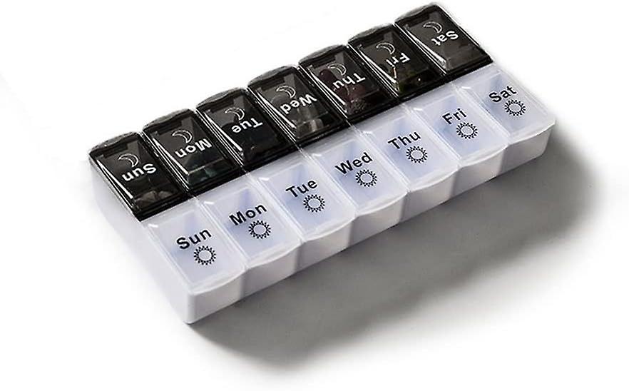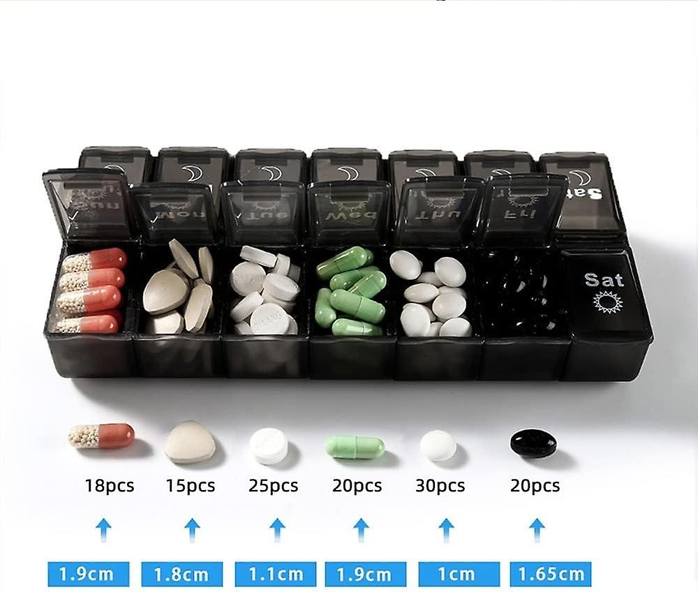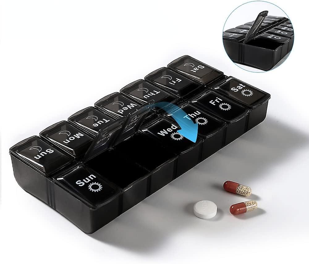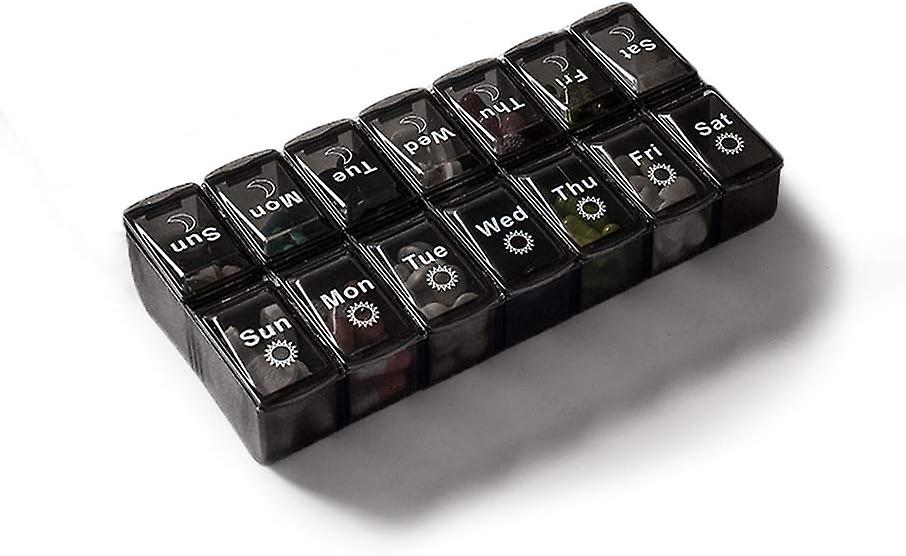 Day Medicine Box - 7 Compartments - 2 Compartments - Medicine Box - Easy Open - 14 Compartments - Weekly Division (all Black)