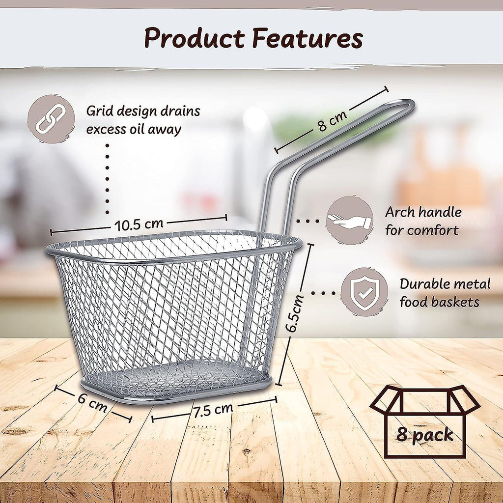 Serving fry baskets are perfect for caterers and restaurants. Mini Stainless Steel Chips Baskets are perfect for individual servings of fries and fries. Mini Stainless Steel Chips Baskets are ed in color and made of stainless steel. The base of the basket measures 6cm x 7.5cm and if you take a look at our second image with the dimensions you can see the size of the top and the . The baskets of french fries set can be used at home for your family, and are perfect for holding french fries and french fries for individual servings. They can be lined with grease paper in restaurants or used for pubs or catering to add a bit to your plate The set of 8 mini fry baskets is perfect for holding your chips and fried after frying and should not be fried. The set of 8 can be stacked when not in use, or hung on s on the wall or on hooks in the kitchen.
