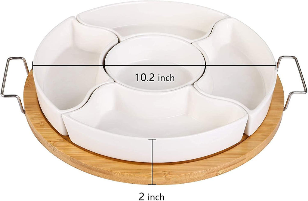 The ceramic dinnerware set measures 26cm diameter x 5cm H, includes 6 removable bowls supported by a 28cm diameter natural bamboo top. The hood in the picture is not included. The five compartments are separated, so you can easily refill food for parties. You don't have to take the whole tray away from your guest to refill it. Easy to wash and store. WHITE ELEGANT DESIGN: Our serveware set consists of 4 bowls centered around a round condiment dish. The food against the white bowls makes for an incredible and delicious presentation. You can easily carry this set by strong bamboo top with two metal handles without fear of falling, all bowls have individual place on the round tray and Carved Rimmed Edge. Classic Kitchen Dining Servingware: Show your guests the beautiful and elegant crockery for storing chips, dip, snacks, charcuterie, cheese, candy, olives, nuts, fruit, vegetables, spices and various appetizers.