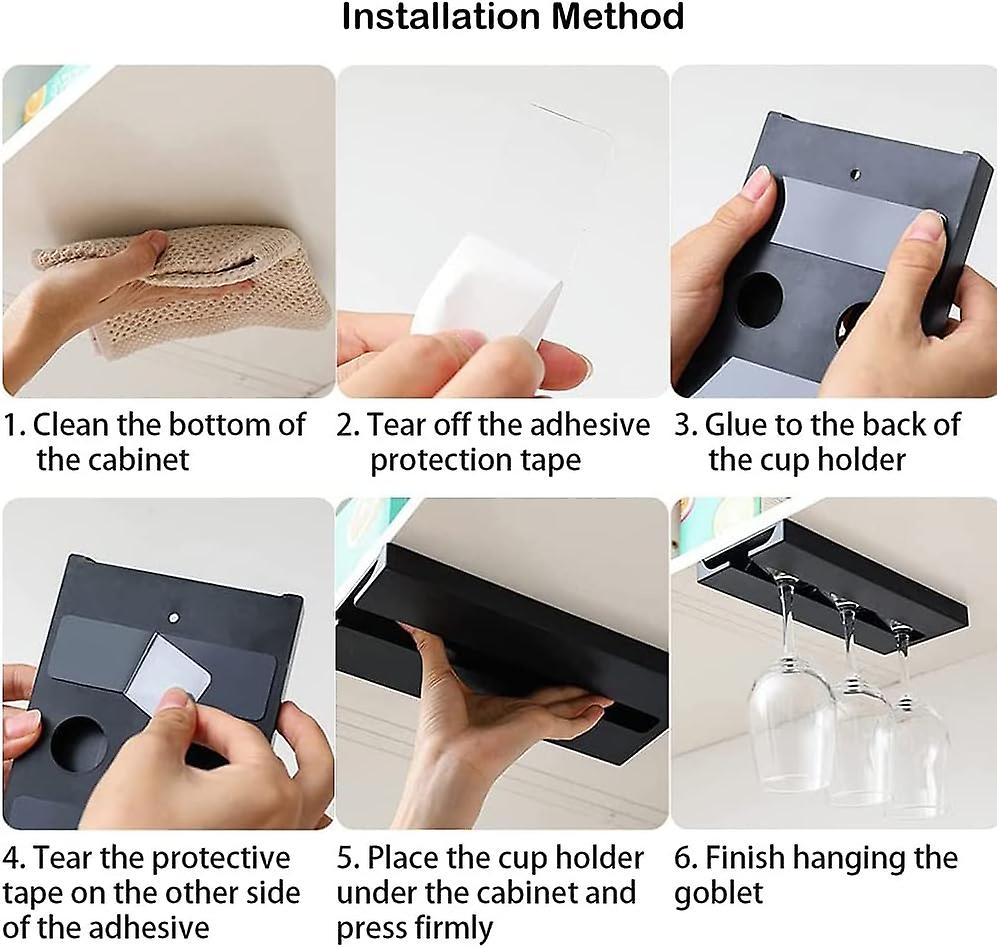 High Quality MaterialThe hanging wine glass holder is designed with durable construction for easy cleaning and long lasting use. Durable and not easy to bend and close under load. 2 Rows Wine Glass HolderThe hanging wine glass holder has beautiful, elegant and simple line design and can hold up to 6 wine glasses. high capacity. Meet the needs of most people in quantity. Easy to InstallThe hanging wine glass holder does not need to be punched and can be used directly with tape. No holes need to be drilled in the cabinet. Anti-slip and anti-drop, good-looking and practical. Save spaceThe wine glass rack can effectively use useless space and easily create more space for storing wine glasses. Show your wine glass. Keep the kitchen counters and cabinets tidy. Widely UsedThe wine glass rack features an opening wider mouth design, which is suitable for families, restaurants, hotels and bars. Suitable for bordeaux glasses, shot glasses, cocktail glasses, etc.