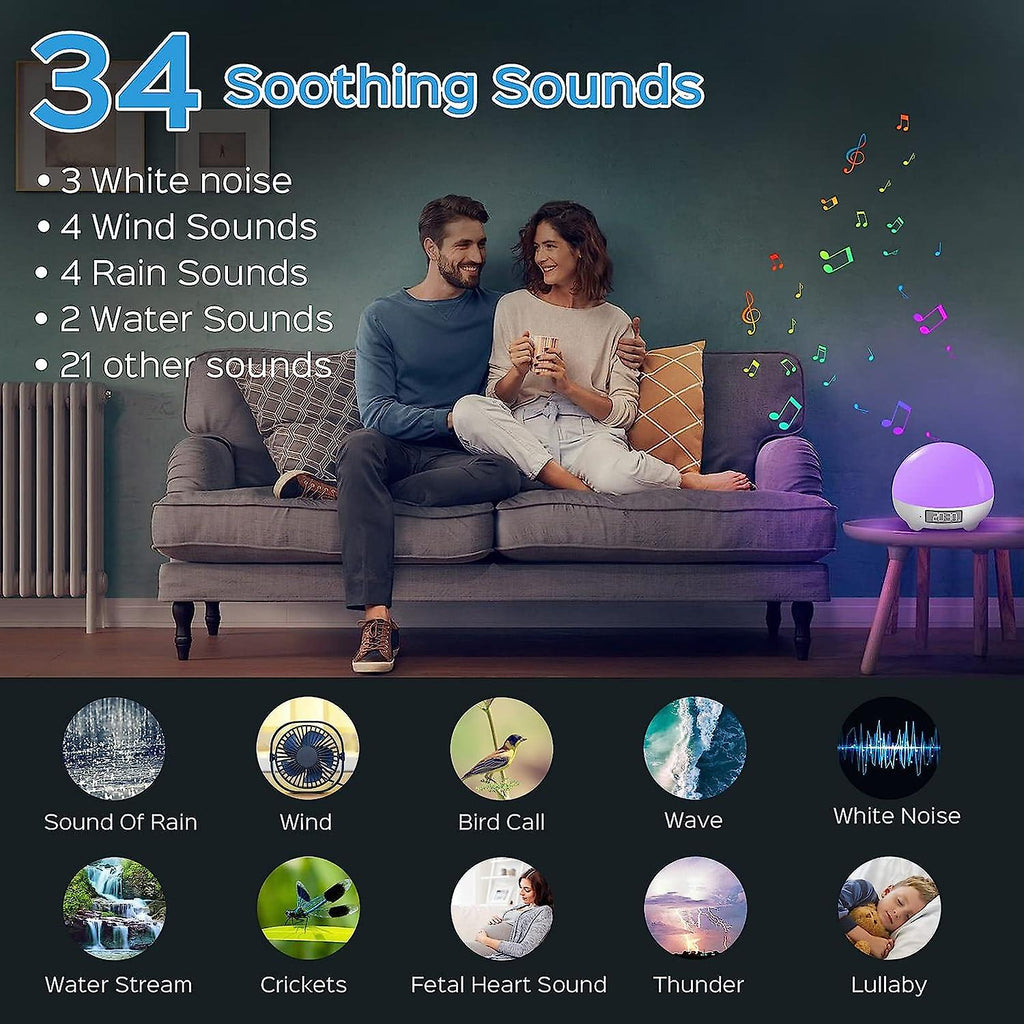 With this smart night light, you can change colors, brightness settings, sound switches and much more. Control via a smartphone. There are even up to 16 million colors and 34 soothing music, and the natural and soft lighting makes it very suitable for children or toddlers. White Noise machines have developed sounds especially for infants, such as womb sounds, frog sounds, Cricket Sounds, Lullabies and Music Boxes, plus 26 Nature Sounds, Wind, Rain, Streams, Campfires, Thunderstorms, Waves, Birds and 3 White Sounds. It can ease your anxiety, relax your emotions, and improve your sleep. It is an ideal sleep aid for infants and adults. (You can adjust the volume range from 0 to 100%) Google Assistant voice control: The still light is compatible with Alexa or Google Assistant, and you can control the light switch, color change, volume and more via voice control. You can say "Alexa, turn on the baby night light" or "dim the baby night light". Turn off the light when holding the baby. You won't feel overwhelmed. Timer Function Create personalized lighting alarm clocks. For example you can set the "morning light" to 30% brightness at 6am, choose your favorite wind chime sound and set the volume to 51%. It turns on and off automatically according to your family's sleep schedule, so the whole family can have a healthier sleep.