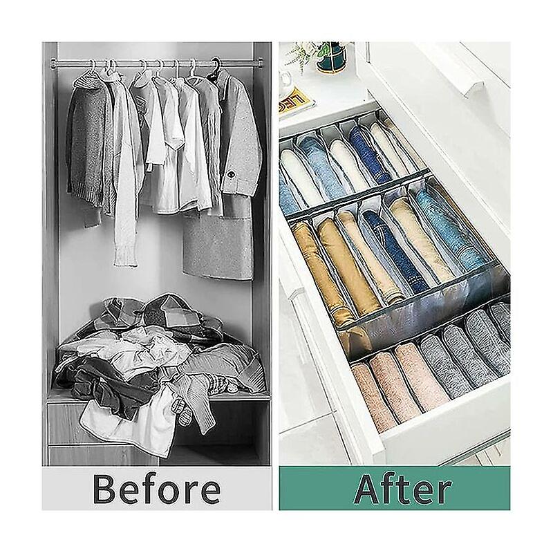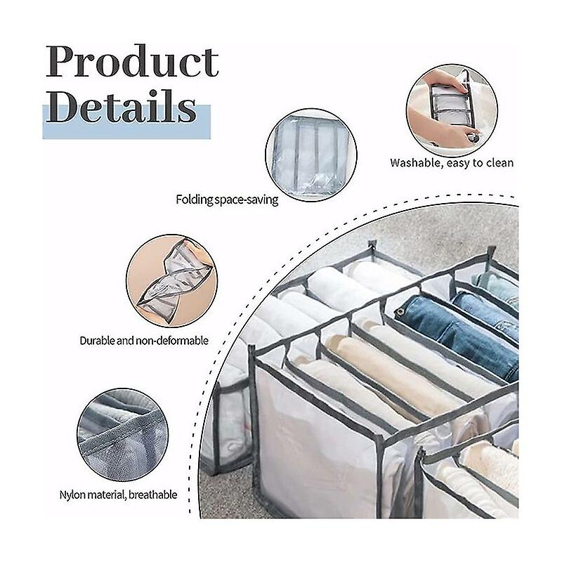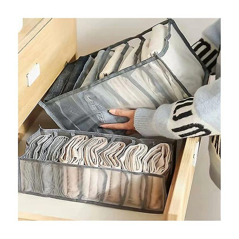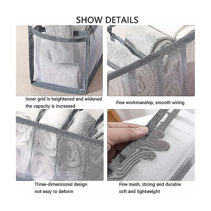 Mesh design with good ventilation: Storage box with white mesh and gray border, the gray border is dirt-repellent and the white mesh keeps clothes clean. Simple appearance but excellent storage function. Hygienic and clean, can effectively reduce underwear odors and keep clothes fresh. When using for the first time, it is recommended to place it in a ventilated place for a while. Easy storage: Three-dimensional design, independent access, thick material, sturdy and stable, can be used throughout the container be moved. Scope of application: Underwear, socks, sweaters, jewelry, magazines, stationery, cosmetics, bras, medicines, toys, small items, clothing, Bedroom with storage scene< /p> Capacity: 18L Color: Gray Gross weight: 0.06 Function: Foldable, portable, movable Size: 12cm x 32 cm x 12cm Packaging: 6 pieces (7 small compartments) Gray High quality and durable material: Made of washable mesh fabric, durable and dimensionally stable. Improving environmentally friendly, healthy and odor-free material. Foldable and washable: When not in use, the drawer storage box can be quickly folded into a flat shape to save space. Convenient to carry and store, ideal for travel. Versatile Use: These pants storage boxes are used to store clothes
