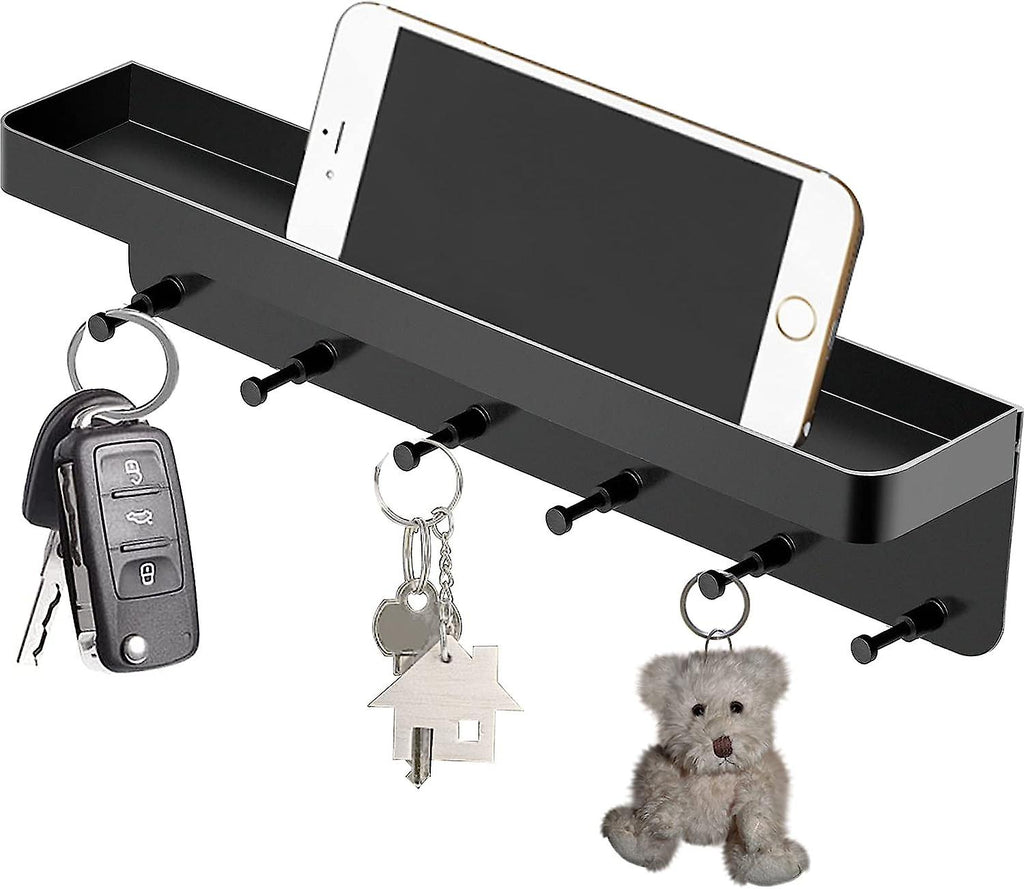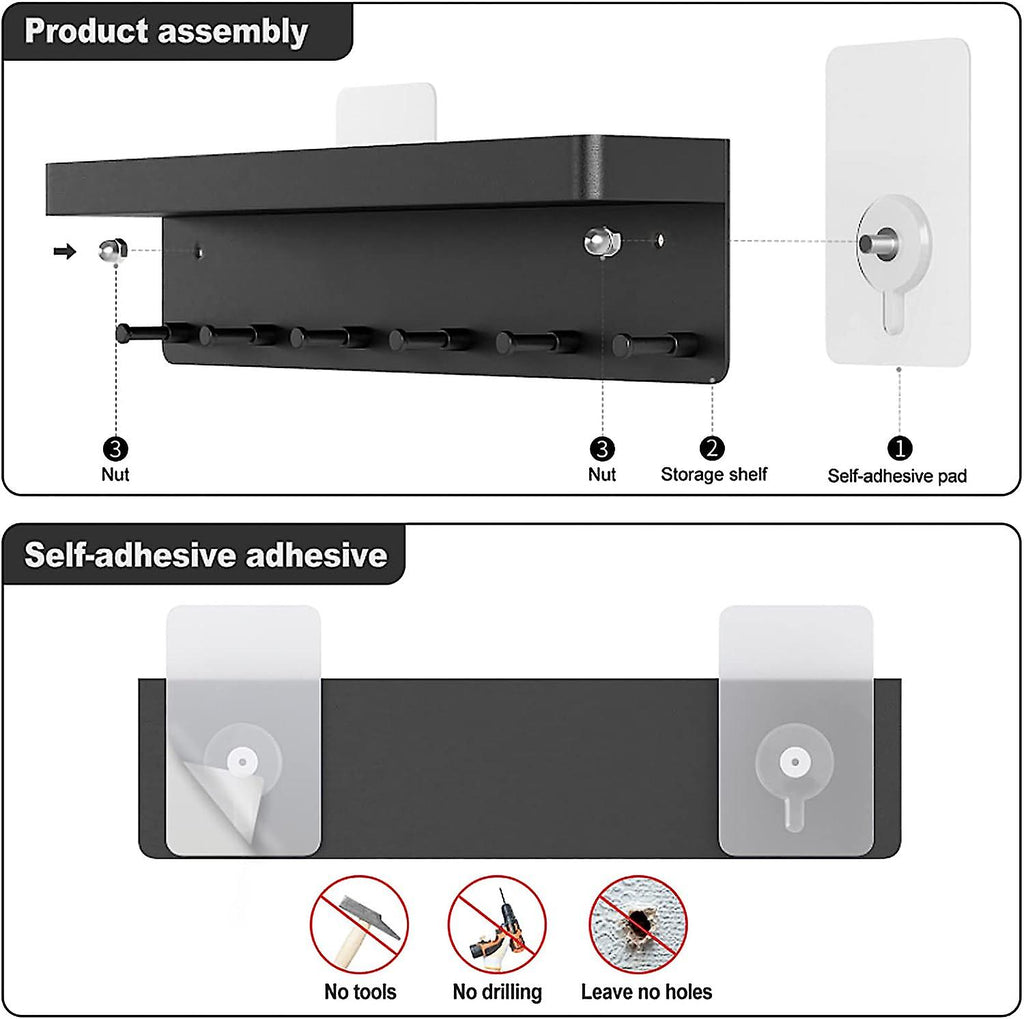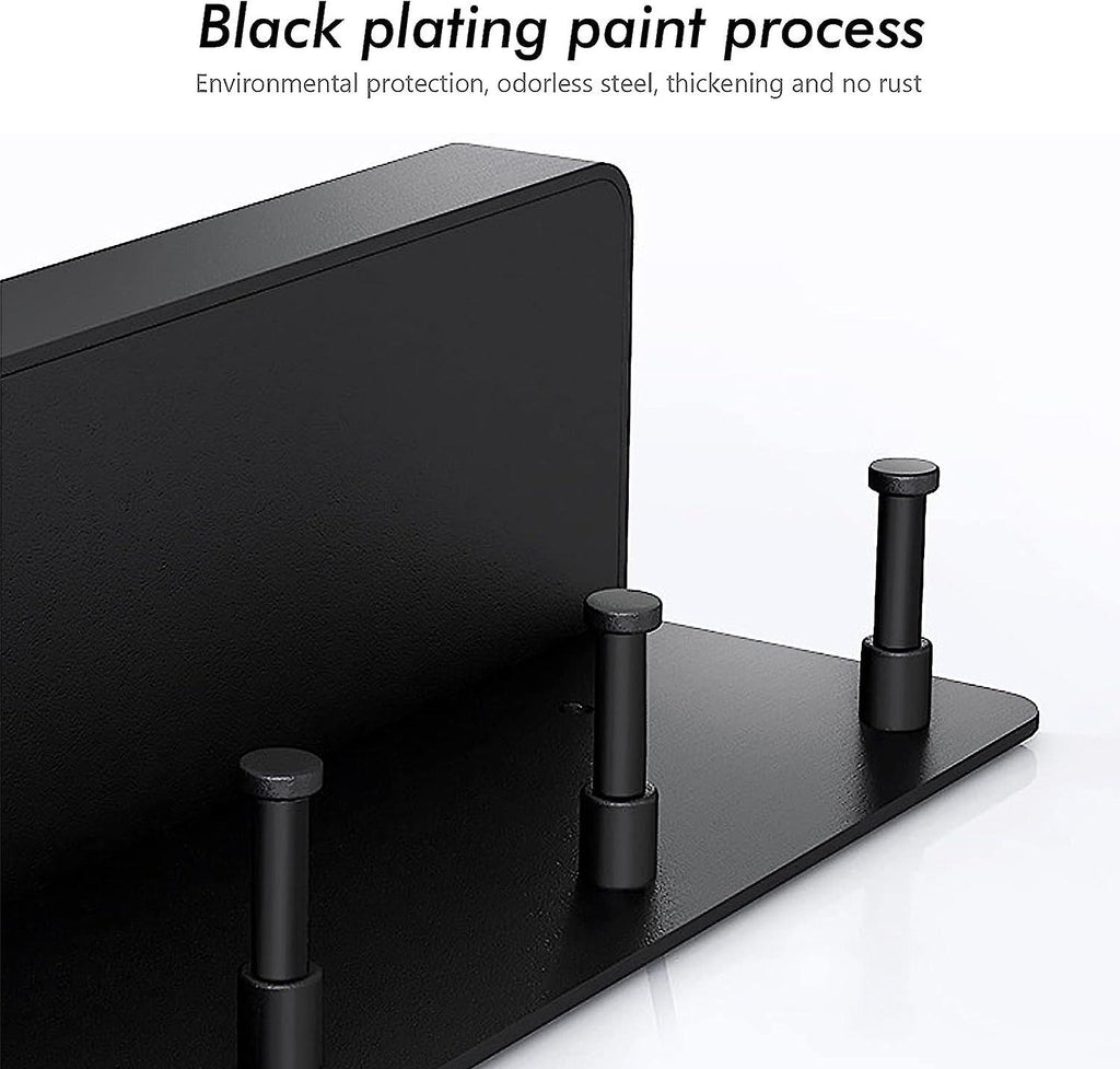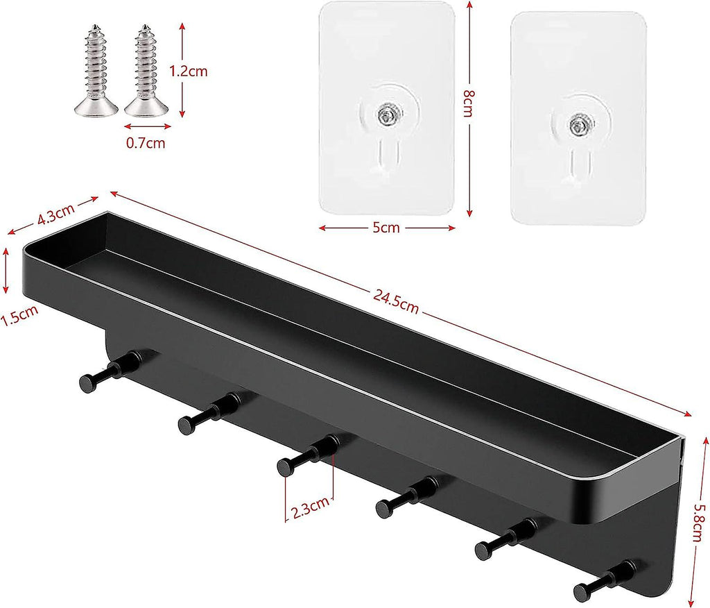 [High Quality Material]: Made of thickened black lacquered stainless steel. Durable, made of stainless steel, Simple and elegant design, suitable for different lifestyles. [unique design]: 2-in-1 design of paddle and hook. The 2.3cm long hook design can hook the clothes and not easily drop them, while the 1.5cm high shelf edge protects the items from falling damage. [Installation without bracket]: Use the included tape or self-adhesive hanger nails, stick them to the back of the shelf, remove the protective film, and stick them to a clean, smooth surface. [practical dimensions]: 24.5 x 5.8 x 4.3 cm. Bowl: 24.5 x 4.3 x 1.5cm; Hook length: 2.3cm Note: If installed with tape, do not use after 48 hours of installation. [Versatile]: Can be used in the hallway, entrance area , living room, kitchen, bathroom, bedroom, office, etc. Note: Recommended for glass, metal, tile or marble.