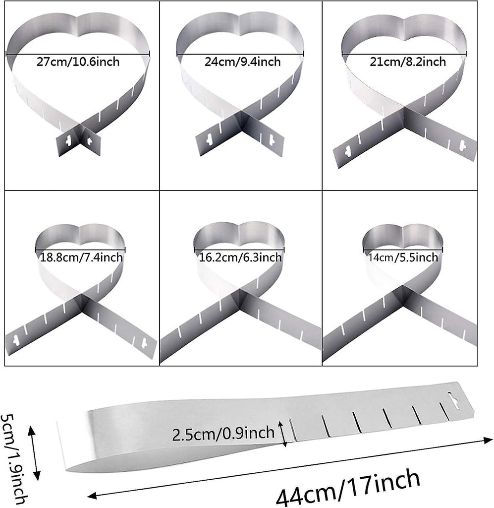 The heart cake rings are made of corrosion and rust resistant stainless steel. non-toxic, no peculiar smell, safe to use. Easy to clean easier to loosen and more convenient to use. easy to clean and dishwasher safe, safe distance is up to 475 when placed in freezer and oven ReusableNot easily deformed or broken, safe to use and reusableAre durable, have a long service life. 6 sizes more creativityHeart baking dish without base for baking, forming and layering heart-shaped cakes, adjustable from variably from 14.5 to 27 cm wide, also for hearty pizzas etc. Easy to shape Damaged cake or cake bases after baking are a thing of the past, because the frame adjustable core baking pan can be easily removed by expanding it.