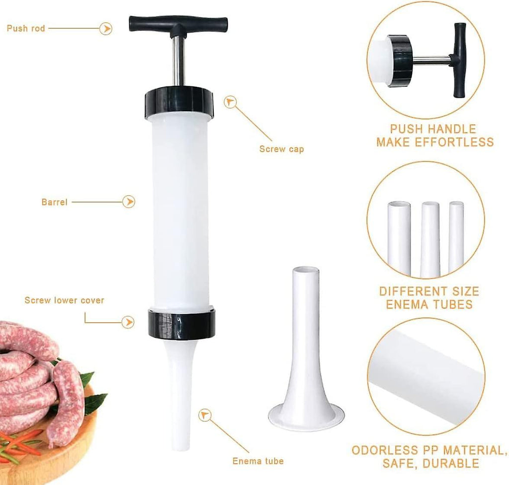 Our sausage enema is made of high quality plastic, which is odorless, non-toxic, safe and hygienic, and can be in contact with food; the stainless steel push rod is durable, will not rust, and can be reused. EASY TO USEThe enema tool is a manual push type, and the handle design is ergonomic, comfortable and labor-saving. You just need to prepare the minced meat, choose a funnel suitable for the size and install it, then put the minced meat into the sausage tube and push the handle down to make sausages easily. WIDE USEThe manual enema is suitable for many occasions such as festivals and family gatherings. Help you prepare a variety of delicious sausages, enjoy food with your family and friends, and have fun preparing food. EASY TO CLEANOur enema has 3 nozzles of different sizes, which can be disassembled and cleaned when not in use, which is convenient for next use. CARE AND STORAGEThis sausage machine is small in size, light in weight, very convenient to carry and save storage space; please clean it immediately after use and store it in a ventilated and dry place.