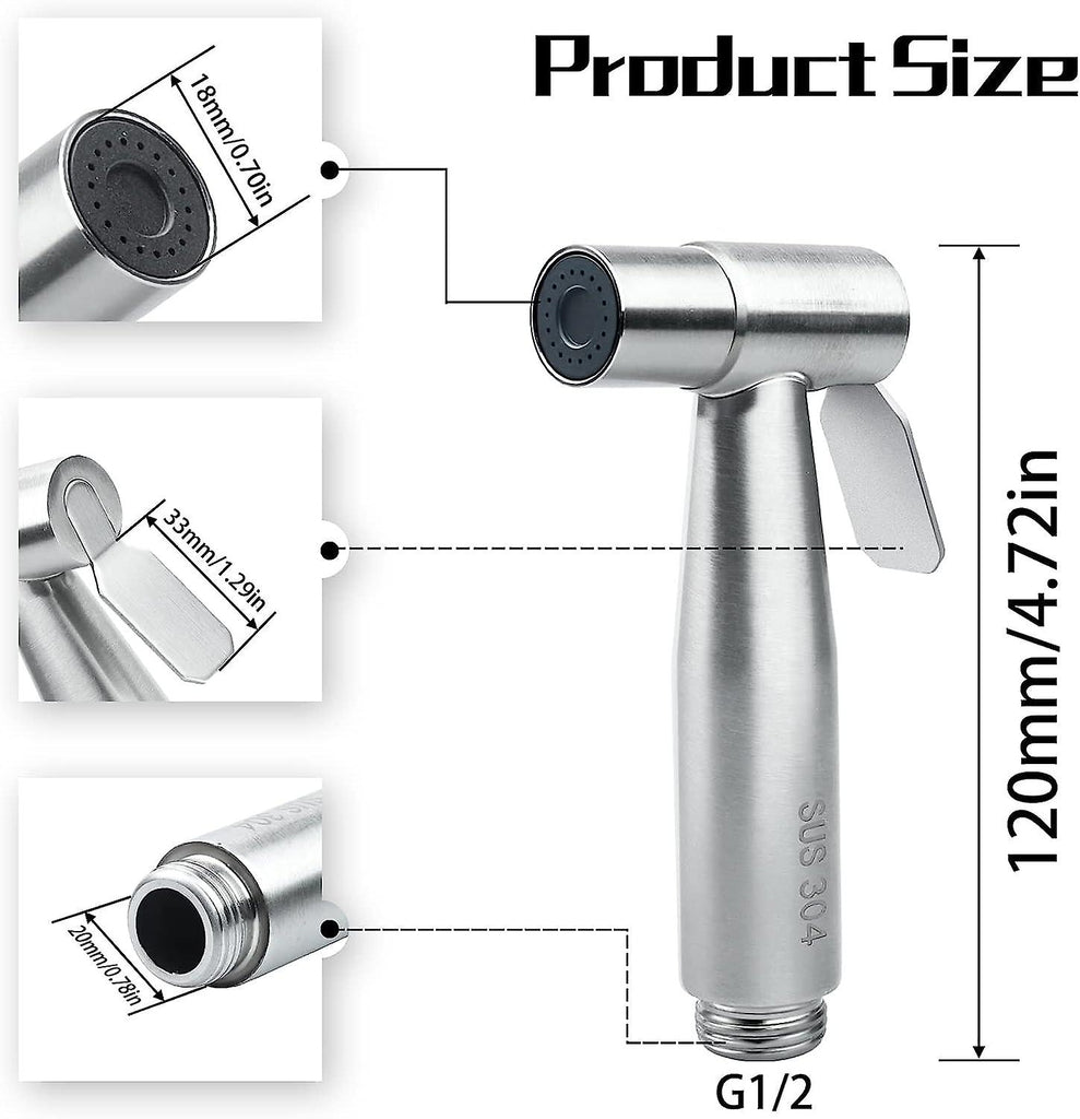 Can Control Water Pressure: This upgraded stainless steel toilet hand shower provides simple water pressure control and strong water flow for easier cleaning. The internal pressure type design provides a powerful release of water to save time and reduce the stress of household chores. High Quality: The toilet toilet hand shower is made of high quality 304 stainless steel. quality, which is sturdy and resistant to rust, scratches and leaks. Provide years of service life, not easy to damage. Easy to Use: The stainless steel toilet hand shower provides a simple water pressure control switch. Press the joystick to easily control the water flow. The water pressure is stable and uniform. The toilet sprayer can easily be moved to wash the floor and the toilet. Simple daily cleaning makes our life easier. Easy to Install: You need to pay attention to the size when purchasing. Our shower toilet hand shower fits standard 1/2" shower hoses and fits most household shower hoses. No additional tools are needed, our toilet hand shower (hose not included) just screws in and goes. Wide Range of Applications: The toilet hand shower is very suitable for home cleaning, especially for baby cloth diaper cleaning, pet cleaning, body purifier, cleaning indoor sanitary; For outdoor washing is also a good choice, car cleaning, garden work, etc.