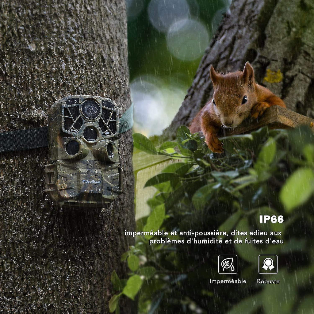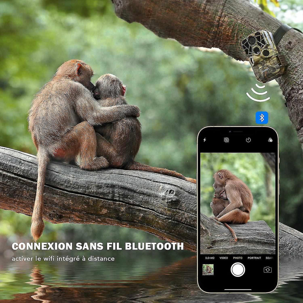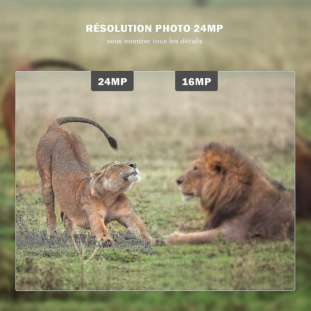 4K/24MP Hunting Camera: A reliable and well-equipped hunting camera for wildlife viewing, game counting, surveillance and countless other applications with photos and video with sound day and night. Resolutions up to 24 MP/4K (interpolated). Thanks to the camouflage pattern, it is waterproof, weatherproof and discreet - won't scare animals and prevent theft. Record using separately provided SD memory cards up to 128 GB.WiFi APP Hunting Camera: WiFi and Bluetooth, setup, control and image transfer via smartphone app for Android and iOS. Even without a cable attached to the hunting camera, images and video can be transmitted comfortably wirelessly - useful if the hunting camera is hard to reach, such as hanging from a tree. The power supply is changed with commercially available 1.5V AA batteries or rechargeable batteries.IMAGE AND VIDEO: Capture colorful daytime photos and well-lit black-and-white nighttime photos thanks to the built-in IR-cut filter that turns on automatically. Wide range (940nm) invisible LED light for night lighting, invisible to people or animals, no dark red glow. Three PIR motion detectors with 0.2 second trigger delay and 120 coverage can also detect animals that only briefly pass in front of the camera.Hunting Camera Smartphone Transmission: Silent operation, true night vision even in complete darkness, maximum lighting range up to 20 m. Time-lapse tracking of plant growth or building construction progress, etc. Dust and waterproof, up to IP66 standard. Low energy WiFi activation via Bluetooth enables contactless image and video transmission via smartphone app even in inaccessible places.Ideal Christmas Gift: Modern and Inexpensive Hunting Camera, Weatherproof, Heat and Cold Resistant, Powered by 8 Replaceable 1.5V AA Batteries/Battery Pack, Provides True Night Vision Even in Total Darkness, Completely Invisible Remote lighting, installation material, USB cable and instructions in German included. The ideal gift for animal, plant and nature lovers, hunters, collectors and of course yourself.