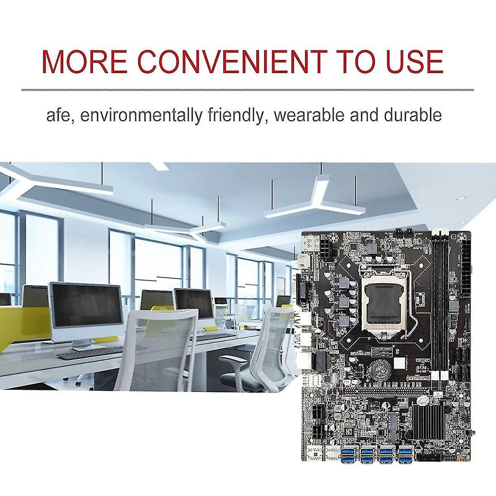 1. The B75 USB-BTC motherboard uses all-solid capacitors to make the motherboard more stable; it supports LGA1155 CPU and uses the B75 chipset to give full play to the CPU performance2. Innovative design, convert PCIE 1x directly to USB3.0 interface, reduce intermediate transmission links, reduce costs, reduce signal attenuation, and make continuous long-term work more stable.3. 8-port USB 3.0 interface: With the plug-and-play function, you can instantly experience the data speed 10 faster than USB 2.04. The motherboard of B75 mining machine has low power consumption, low calorific value, energy saving and power saving. The actual work done is lasting and rewarding.5. The motherboard is low in and in expansion interfaces, suitable for the mining industry.(1) Display interface: 1*-compatible, 1*VGA(2) USB rear: 2*USB2.0(3) USB front: 1*USB2.0(4) USB rear: 2*USB3.0(5) USB front: 1*USB3.0(6) interface: 4*SATA(7) Graphics interface: 8*PCIE1X (USB )(8) Network card interface: 1*LAN 100M network card(9) Memory slot: 2*DDR3(10) CPU socket: LGA (1155)(11) Chipset: BGA (B75)(12) interface: 1*MSATA(13) BIOS initial restoration: JCMOS(14) Speaker interface: 1SPK(15) Power interface: 24pin_ATXPWR(16) Power interface: 4pin_ATX12VCPU type: Support For 1155CPU socket: LGA_1155CPU model: G530 CPUMemory type: support 2*DDR3Maximum memory capacity: support a of 16G, a single maximum of 8GMemory description: support 1333/1600MHz frequencyChipset: For B75 ChipsetAudio chip: N/ANetwork card chip: 1*REALTEK 100M network cardProduct size: 230 x 175mmMaterial: PCBcolour: blackPackage Contents:1 x B75 motherboard1 x G530 CPU1 x cooling fan1 x 4G DDR3 RAM1 x thermal pad1 x switch cable1 x SATA cableOnly the above package content, other products are not included.Note: Light reflection and different displays may cause the color of the item in the a little different from the real thing. The measurement allowed error is +/- 1-3cm.