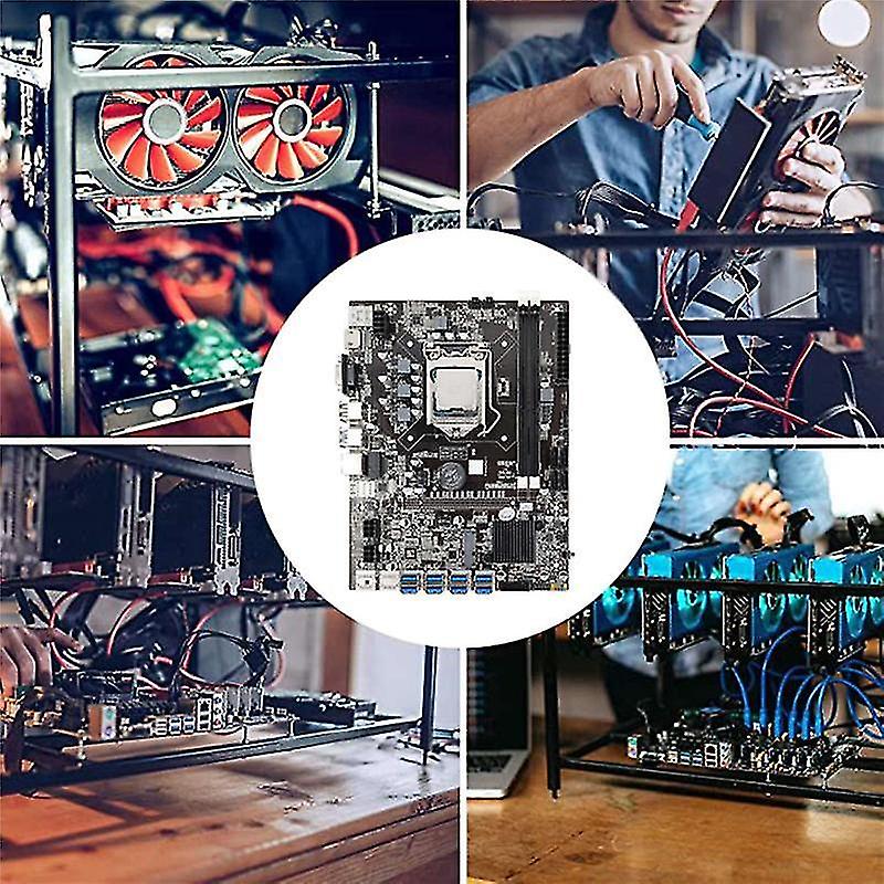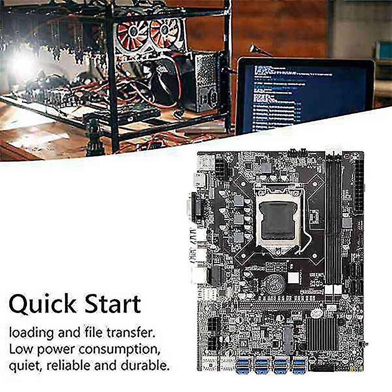 1. The B75 USB-BTC motherboard uses all-solid capacitors to make the motherboard more stable; it supports LGA1155 CPU and uses the B75 chipset to give full play to the CPU performance 2. Innovative design, convert PCIE 1x directly to USB3.0 interface, reduce intermediate transmission links, reduce costs, reduce signal attenuation, and make continuous long-term work more stable. 3. 8-port USB 3.0 interface: With the plug-and-play function, you can instantly experience the data speed 10 faster than USB 2.0 4. The motherboard of B75 mining machine has low power consumption, low calorific value, energy saving and power saving. The actual work done is lasting and rewarding. 5. The motherboard is low in and in expansion interfaces, suitable for the mining industry. (1) Display interface: 1*-compatible, 1*VGA (2) USB rear: 2*USB2.0 (3) USB front: 1*USB2.0 (4) USB rear: 2*USB3.0 (5) USB front: 1*USB3.0 (6) interface: 4*SATA (7) Graphics interface: 8*PCIE1X (USB ) (8) Network card interface: 1*LAN 100M network card (9) Memory slot: 2*DDR3 (10) CPU socket: LGA (1155) (11) Chipset: BGA (B75) (12) interface: 1*MSATA (13) BIOS initial restoration: JCMOS (14) Speaker interface: 1SPK (15) Power interface: 24pin_ATXPWR (16) Power interface: 4pin_ATX12V CPU type: Support For 1155 CPU model: G530/G540/G550/ G620/G630/G640 /G1610/G1620/G1630 Random CPU Maximum memory capacity: support a of 16G, a single maximum of 8G Memory description: support 1333/1600MHz frequency Network card chip: 1 x REALTEK 100M network card Product size: 230 x 175mm color:Black Material:PCB Package Contents: 1 x B75 motherboard 1 x random CPU(Cannot select specified CPU) 1 x 4G DDR3 RAM 1 x cooling fan 1 x thermal grease 1 x Switch cable 1 x SATA cable (elbow) Only the above package content, other products are not included. Note: Light reflection and different displays may cause the color of the item in the a little different from the real thing. The measurement allowed error is +/- 1-3cm.