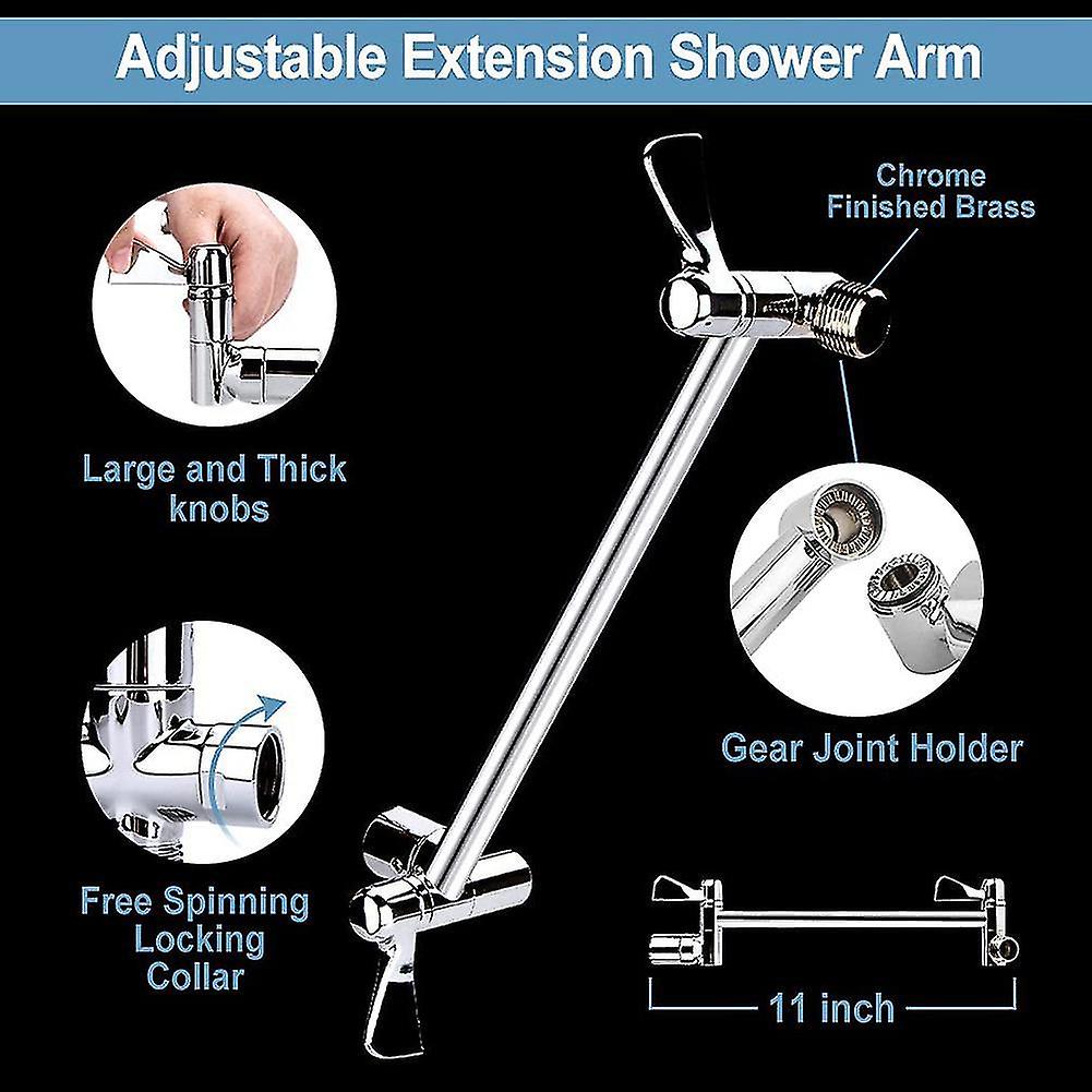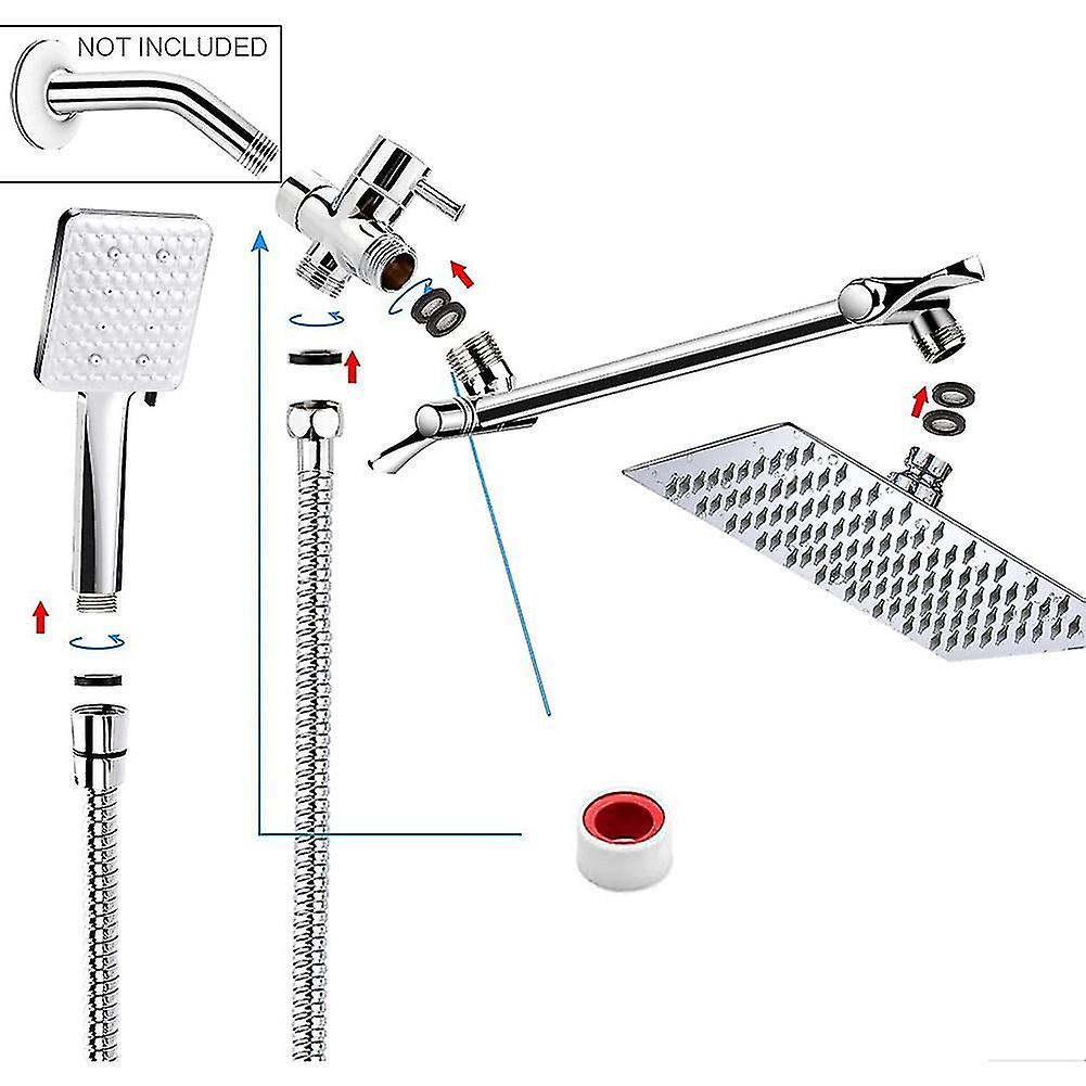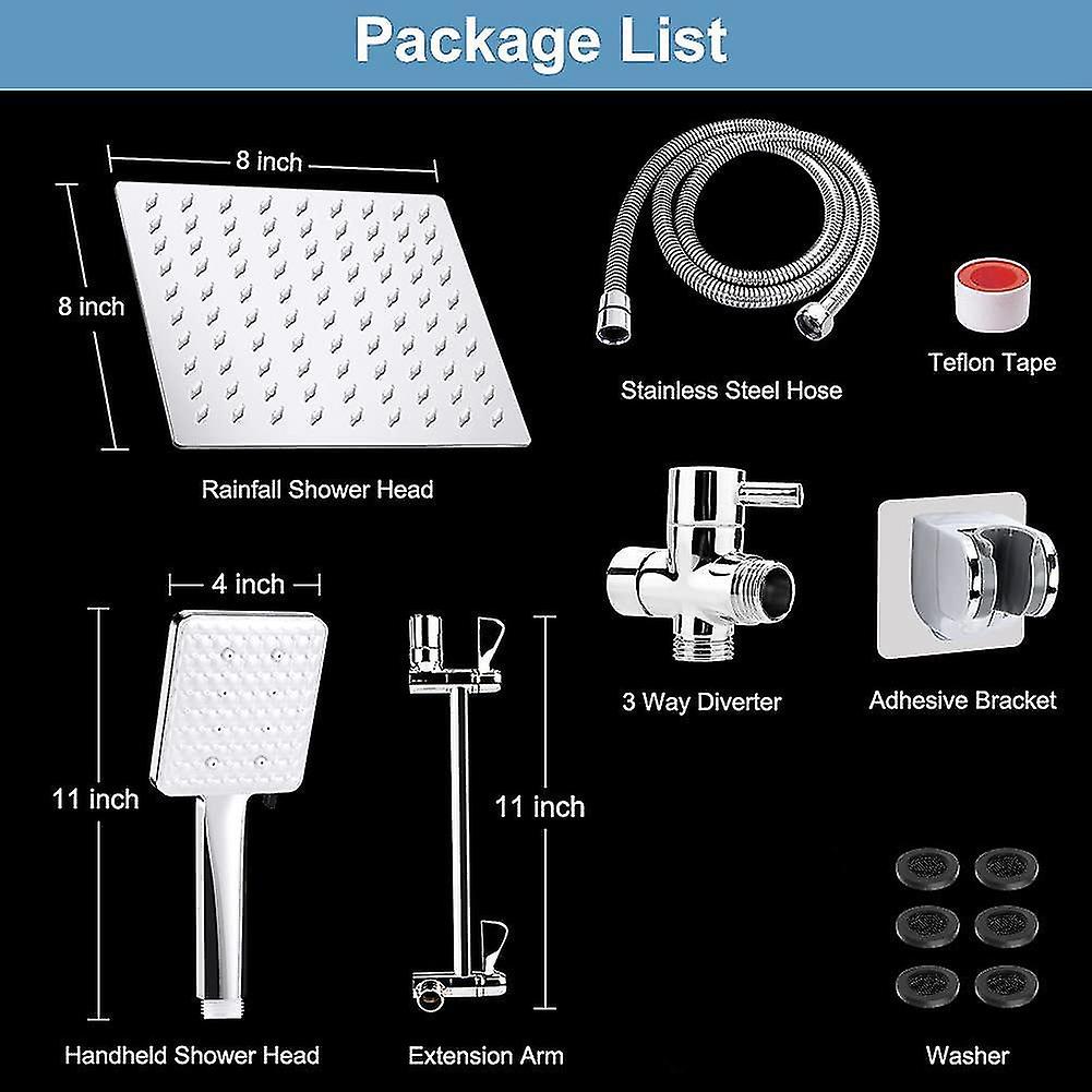 Excellent Shower Heads Combo: 8inch Large Square Rainfall Showerhead, Chrome Face 6 Spray Settings Shower Head with Handheld ,3 Way Diverter, 5ft Stainless Steel Hose, Suction Cup Shower Bracket, PTFE Tape, Washer.8 inch Large Rainfall Showerhead: The 8-inch large square shower head is very durable. It is made of high-quality stainless steel and has a reliable leak-proof connection. Its 100 tightly combined self-cleaning silicone nozzles provide excellent water flow coverage.6 Setting Chrome Handheld Shower : 6 spray settings: Spray, Massage, Mist, Mist+Spray, Spray+Massage, Mist+Massage, which is suitable for baby shower, massage or pets shower, etc. 6 mode shower mode and 60 inch Long shower hose make you more convenient. Angle-adjustable modern design all-chrome finish increased sense of fashion.11 inch Adjustable Extension Arm:Not worry about breaking or leaking,11 inch Adjustable extension shower arm fits any shower heads.You can adjust the showerhead for awesome angle and height,2-Foot vertical movement range makes it easy to tighten the joint.Easy to Install:No need to call a plumber- Connects in minutes to any standard overhead shower arm, no tools required.Colour:SilverMaterial:stainless steelPackage Contents:1 x hand shower1 x top spray1 x connecting pipe1 x three-way water divider1 x bracket1 x raw material tape1 x extension bracket1 set x washersOnly the above package content, other products are not included.Note: Light shooting and different displays may cause the color of the item in the picture a little different from the real thing. The measurement allowed error is +/- 1-3cm.