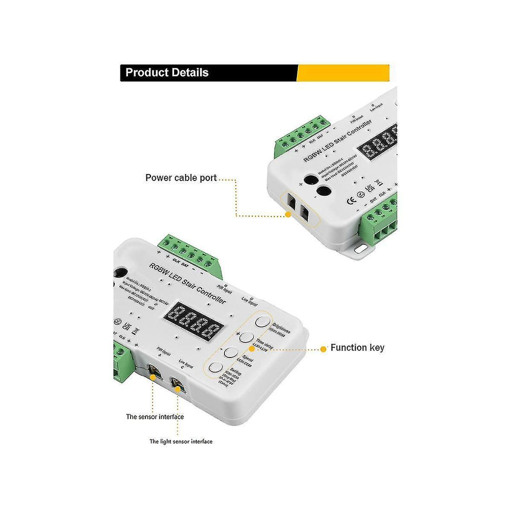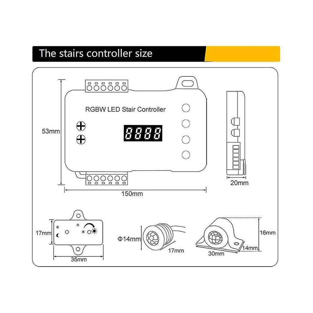 Fine workmanship and stable performance. Automatic control, saving energy. High sensitivity and strong practicability. Durable in use. Used in corridors, toilets, warehouses, stairs, etc. Product Name: RGBW Staircase LED Lighting Controller Input voltage: DC12V-DC24V Maximum current: 10A Maximum load: DC12V/120W, DC24V/240W Function: adjust mode/brightness/delay time/speed/color Material: ABS color: White Package Contents: 1 x Controller 1 x Main Cable 1 x Light Sensor Cable 2 x Human Sensor Cable 1 x Extension Cable Only the above package content, other products are not included. Note: Light reflection and different displays may cause the color of the item in the a little different from the real thing. The measurement allowed error is +/- 1-3cm.