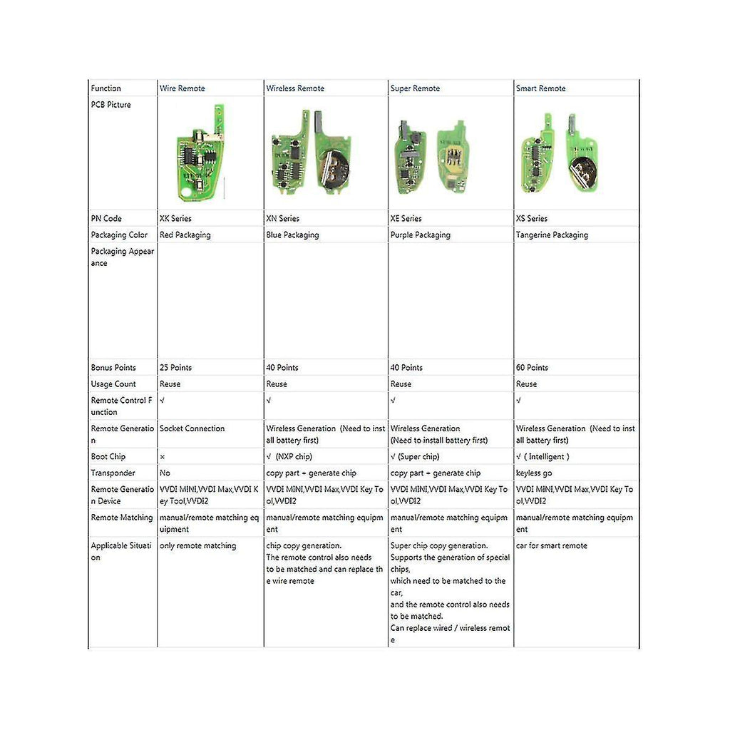 It is compatible with all the VVDI tools including for VVDI2 Mini Remote Programmer, VVDI Key Tool etc. Support generation or cloning by VVDI Key Tool, VVDI Mini Key Tool, VVDI2, VVDI Tool Max. Have passed quality control leaving the , with quality assurance, you can buy with . Specification: Condition: New Color: black Material: ABS+ metal Type :for vvdi XS Series Smart Remote Key PN: XSKF30EN Button: 4 buttons Transponder:Yes Battery/ Blade: No Battery Model: CR2032 How to for vvdi super remote and wire/wireless remote Key? Similarity: They all have same PCB and remote contact part. And for vvdi Super remote covers all functions of wire and wireless key. 1. wireless key is with NXP Chip,which is like the hitag series chips,like the chip ID46 and ID47 2. wire key is without NXP Chip. 3.for vvdi Super remote is with super chip inside, can support more key types. Package Contents: 5 x XSKF30EN Universal Remote Key Only the above package content, other products are not included. Note: Light reflection and different displays may cause the color of the item in the a little different from the real thing. The measurement allowed error is +/- 1-3cm.