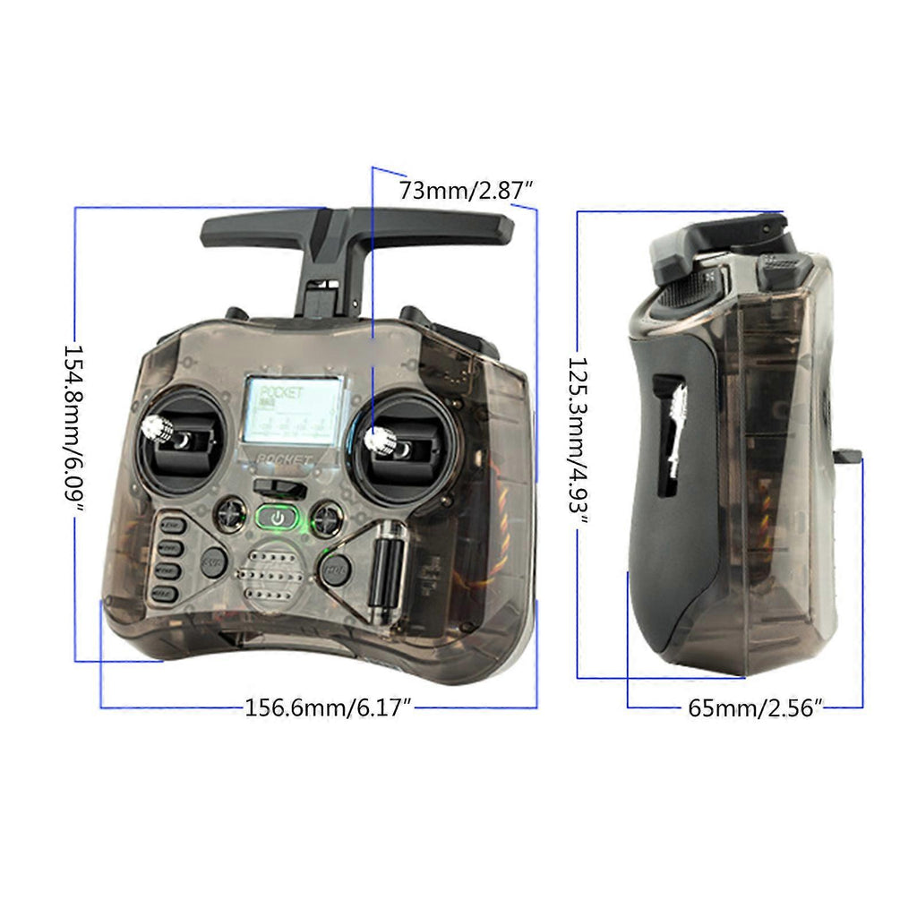 Features: This device supports ELRS/CC2500 protocol, ensuring stable and reliable signal transmission, with a lightweight design for easy operation. Features hall effect gimbals as standard for smooth cantering & precise response With LED light help visualizes your switching inputs LCD Screen offering a perfect balanced of size and functionality Trim buttons for easy channel trimming External Module Bay for module/Tracers etc Specifications: Item: Pocket Transmitter Remote Control Physical dimensions: As Pictures Operating frequency: 2.400GHz-2.480GHz Internal Options: CC2500 multiprotocol / ELRS 2.4GHz Color??Black/ White as Pictures Supported protocols: Module dependent Power: CC2500:100mW (20dBm) / ELRS FCC: 250mW (24dBm) / ELRS EU-LBT: 100mW (20dBm) Operational voltage: DC6.6-8.4v Control distance:More than2km 20dBm Operating system: EdgeTX Control channels: Maximum16 (Receiver dependent) Display: 128x64 Monochromed LCD Battery: 2pcs 18650 batteries (Not included) Charging: UsbC QC3 Charging Upgradable Firmware: Via USB or Card Gimbal: Hall-effect Package Includes: 1PC Pocket Radio 1PC Carry Bag 1PC UsbC Cable 1PC Screen Protector 1PC Sticker 4PCS Low Tension Spring 1PC Manual note: Due to the problemsof lighting effect and shooting angle, there mightbe tolerances in the product, please understand. Please allow 1cm errors due to manual measurement.