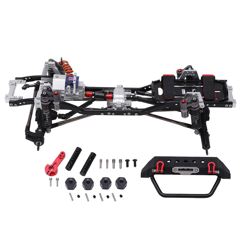 Features 1.Material: Made of high quality materials, safe, environmentally friendly, strong, high strength, wear resistant, good performance, a good choice for DIY upgrades. 2.Stable: Equipped with micro servo two speed gear box chassis, steady transmission system, 313mm wheelbase chassis is suitable for 1/10 RC remote control car. 3.Protection: Front gear box, lower rear damping design, can avoid cutting the protective cover when the hard shell is installed, and maintain the internal integrity. 4.Front Mounted Gear Box Design: Improve body stability and ensure excellent performance, available in two colors. 5.Easy Installation and Disassembly: With front bumper device, the shape is more beautiful, making you feel more convenient during use. Specification Item Type: RC Frame Material: Aluminum Alloy, Plastic, Steel Product Size: Approx. Frame Length: 435mm / 17.1in Frame Width: 76mm / 3in Frame Axle Width: 215mm / 8.5in Wheelbase: 313mm / 12.3in Motor Gear: 0.7M 15T Transfer Case Gear Ratio: 1:1.2 (Single Speed) 1:1 (2 Speed) Two Speed Transmission Gear Ratio: 1:8 (Low Gear) 1:4.8 (High Gear) Applicable: Suitable For 1/10 SCX10 90046 And Other Remote Control Cars Package List 1 x 313mm Frame 1 x Front Bumper 2 x Mounting Posts 1 x 25T Servo Arm 4 x Combiner 4 x Pins 4 x Machine Meter Screws 8 x Screws