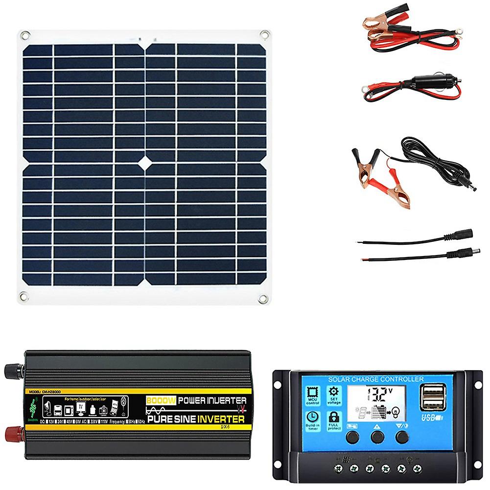 USB voltage regulator: USB 5V, maximum 3A output, can charge mobile phones, mobile power, GPS, lights and other electronic devices. The problem of outdoor power shortage. lighter: car battery charger, car battery is insufficient and unable to the problem.Alligator clip: the cost of the 12V battery, to supplement the extra electricitySuitable for outdoor, camping, hiking, climbing, traveling, fishing, desert . Waterproof design, IP65 grade, light and portable, easy to carry.[Pure Sine Wave] Converts 12V DC to AC 220V household wall power with continuous 1300Watts output ( 8000Watts surge capability) with 1 AC receptacles, one LED Voltage display, high current DC terminals and two LED work lights. ( make that the rated power of the connected devices is 1300W).Specification:Name: Monocrystalline Solar PanelMaximum power: 50WMaximum power voltage: 18VMaximum power current: 1.12AOpen circuit voltage: 20VShort circuit current: 1.5APower Inverter 1300W/8000WSpecifications:Name: Pure sine wave power inverterInput voltage: DC 12V for car (9.8~15V)Output voltage : AC 220V (210~230V)Output frequency: 50Hz/60HZPeaks Power : 8000WRated power: 1300W ( make that the rated power of the connected devices is 1300W ) power: 2600WContinuous power: 1300WMaximum Active Surge Rating (less than 1 second) :8000WMaximum AC Current per socket :8.33AmpereOutput Waveform: True/pure sine wave ( Less than 3% )Efficiency: 90%No Load Current Draw (DC side) Less than 0.6 AProtection: overload, over temperature, high pressure, low pressure, reverse connection and short circuit intelligent temperature control, less than 1300WMaterial: Aluminum+Plastic+Monocrystallinecolour: As shownPackage Contents:1 x inverter1 pair x red and black battery clips1 x lighter1 x solar controller1 x solar panel2 x DC cables1 pair x DC alligator clipsOnly the above package content, other products are not included.Note: Light reflection and different displays may cause the color of the item in the a little different from the real thing. The measurement allowed error is +/- 1-3cm.