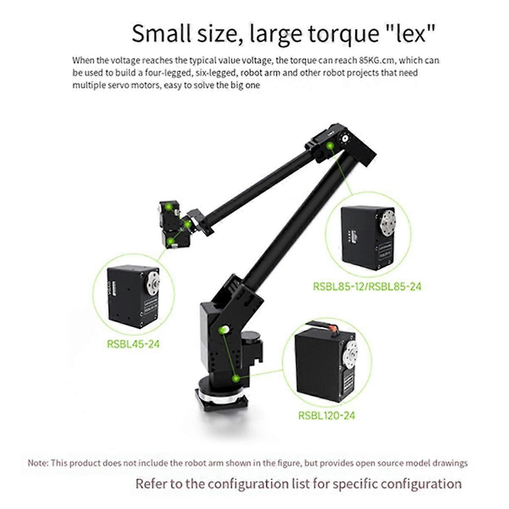 1. 85kg.Cmrs485 Metal Servo Motor, Metal Shell Brushless Motor, 360 Magnetic Encoding Servo Motor 2. Sturdy And Structural Design, All-Aluminum Alloy Shell + Cnc Precision Manufacturing, Improves The Heat Resistance, Dimensional Stability, Rigidity And Mechanical Performance Of The Servo Motor Shell 3. Brushless Motor, Steel Gearbox, Equipped With High-Quality Brushless Motor And Steel Gearbox To The Strength And Durability Of Servo Motor Power Transmission 4. High-Precision 360 Magnetic Encoder, Using 12-Bit High-Precision Magnetic Encoding Angle Sensor. Compared With Carbon Film Potentiometers, The Usable Angle Of Magnetic Encoders Is Expanded To 360, And The Resolution Is Increased By 4 Times. Since There Is A Space Between The Magnetic Encoder Elements And The Radial Magnet, There Is No Friction, Which Effectively Extends The Service Life Of The Servo Motor. 5. When The Voltage Reaches The Typical Voltage, The Locked-Rotor Torque Can Reach 85kg.Cm, Which Can Be Used To Build Four-Legged, Six-Legged, Robotic Arms And Other Robot Projects That Require Multiple Servo Motors, Easily Handling Large Robots. Product model:B:RSBL85-24 Rotation angle:360(0-4095) Position sensor resolution:0.088 (36014096) Mechanism limit angle:None Gear form:high-precision steel (reduction ratio 1:254) Encoder type:360 magnetic encoder ID range:0-253 Baud rate:38400bps-1Mbps (default 1Mbps) Feedback:Position (Position); Load (Load); Speed (Speed); Input Voltage (Input Voltage); Operating Current (Current): Operating Temperature (Temperature) Stalled rotor torque:85KG.cm@24V Working voltage:9-24V (typical value 24V) Air cutting speed:0.154sec/60degree 65RPM No-load current:250mA Stalled rotor current:5.6A Kt constant:25KG.cm/A Note:The picture is a high-definition rendering. Different Batches May Have Differences In Product Appearance, Color, And Printed Characters, Which Will Not Affect The Use. Colour:As Shown Material:PC+ABS Package Contents: 1 * Servo Motor 2 * Metal Bracket 1 * Connecting Cable 1 Set * Screw Installation Only the above package content, other products are not included. Note: Light reflection and different displays may cause the color of the item in the picture a little different from the real thing. The measurement allowed error is +/- 1-3cm.