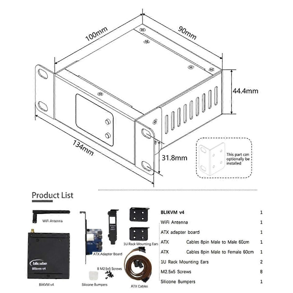 BliKVM v4 is a production-ready, plug and play KVM-over-IP device that offers professional users a convenient solution for remote server or workstation management. It is based on Linux and fully open source. With BliKVM, you can easily power on/off, restart your computer, configure UEFI/BIOS settings, and perform OS reinstallation using an emulated Mass Storage Device. BliKVM simulates a keyboard, mouse, and monitor, all accessible through a web browser, ensuring a seamless user experience. Its hardware-level access guarantees independence from specific remote ports, protocols, or , making it a highly flexible and reliable remote management solution for . Video capturing (support 4K at 30Hz input) Keyboard forwarding Mouse forwarding HDMIvideo loop through ATX Control the server power using ATX functions Fullscreen mode Access via Web UI Support multi language switching Support PoE & DC Support WiFi Serial console port 1.33 inch color display Real Time Clock () Colour:Black Material:Metal + Plastic Some accessories are sent randomly, don't accept the specified, it does not affect the use Package Contents: 1 x BliKVM V4 1 x ATX Adapter Board 1 x ATX for Cables 8Pin Male to Male 60cm 1 x ATX for Cables 8Pin Male to Female 60cm 2 x 1U Rack Mounting Ears 8 x M2.5x5 Screws 1 x Silicone Bumpers Only the above package content, other products are not included. Note: Light reflection and different displays may cause the color of the item in the picture a little different from the real thing. The measurement allowed error is +/- 1-3cm.