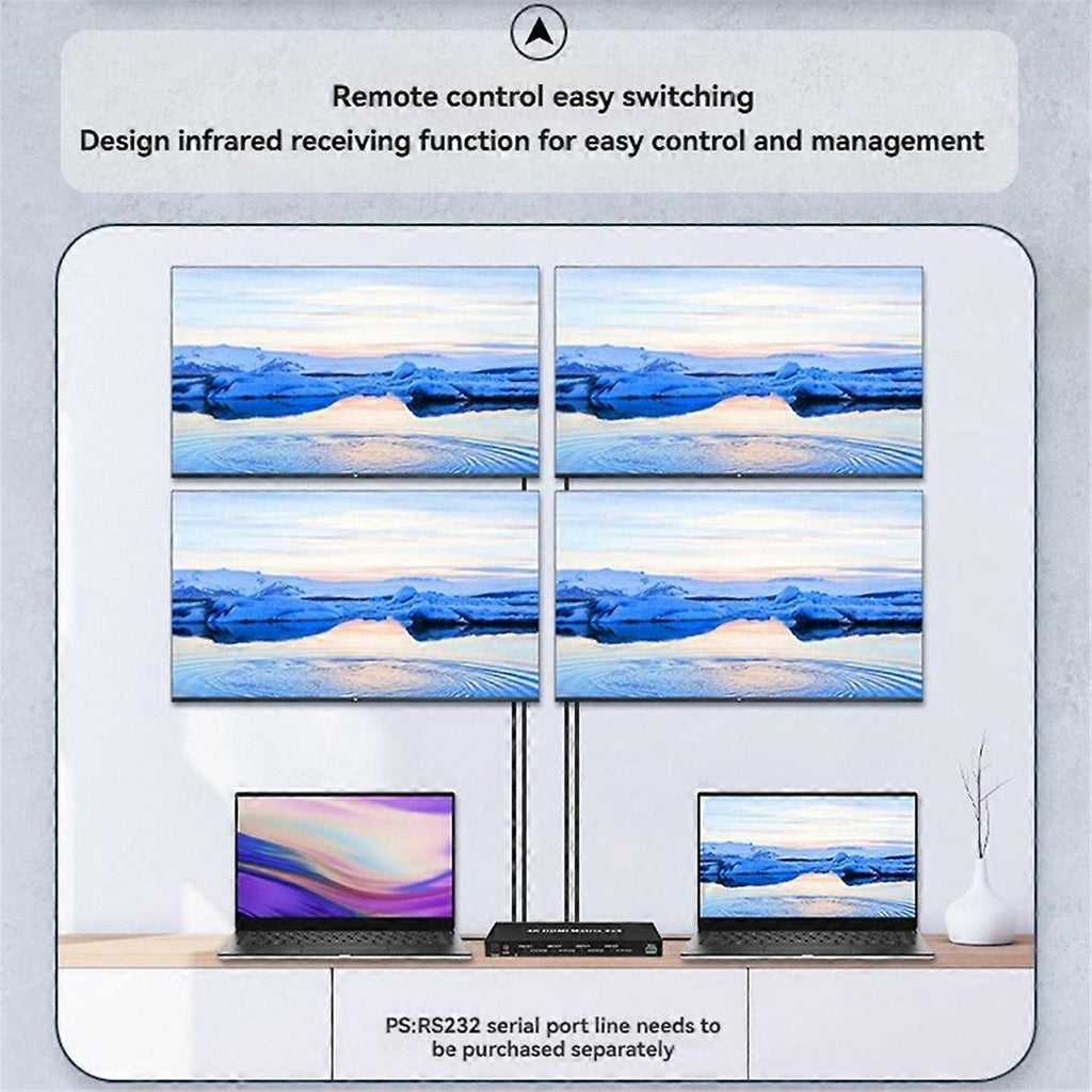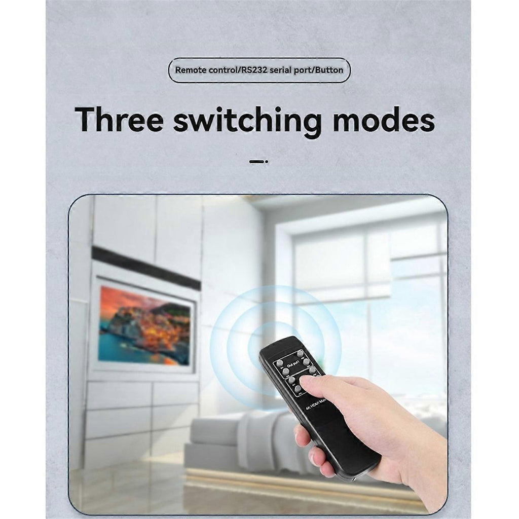 It can easily switch or distribute 4 HD signals on 4 HD compatible monitors or projectors. 4 output ports can display ultra HD video from the same or different signal sources. HD matrix reshapes and amplifies the input signal and transmits it losslessly through cables. Supports audio extraction from -compatible Out1, 3.5mm headphone jack and optical fiber jack for simultaneous output. Applied in entertainment centers, retail and websites, HDTVs, set-top boxes, , projectors, data center control, information distribution, conference rooms, schools and corporate training environments for digital HDTV programs. Resolution: up to 4K@30Hz Supported video formats: 8/10/12-bit color depth Supported audio formats: DTS-HD/-trueHD/LPCM7.1/DTS/-AC3/DSD Maximum transmission rate:8Gbps input port: 4 output port: 4 Maximum operating current: 0.8A Power adapter: Input: AC (50HZ, 60HZ) 100V-240V; Output: DC12V/1A Operating temperature range -15 to +45 Operating humidity range: 5 to 90%RH (no condensation) The product appearance and printed words depending on the batch, but this does not affect use. Plug Type:US Plug, it applies to Canada, India, Mexico, Thailand, Taiwan, the , the Philippines and so on. Voltage:AC100-240V Colour:Black Material:Metal+Plastic Package Contents: 1 * -compatible Matrix 1 * Power Adapter 1 * Remote Control 1 * Chinese and English instruction manual Only the above package content, other products are not included. Note: Light reflection and different displays may cause the color of the item in the picture a little different from the real thing. The measurement allowed error is +/- 1-3cm.