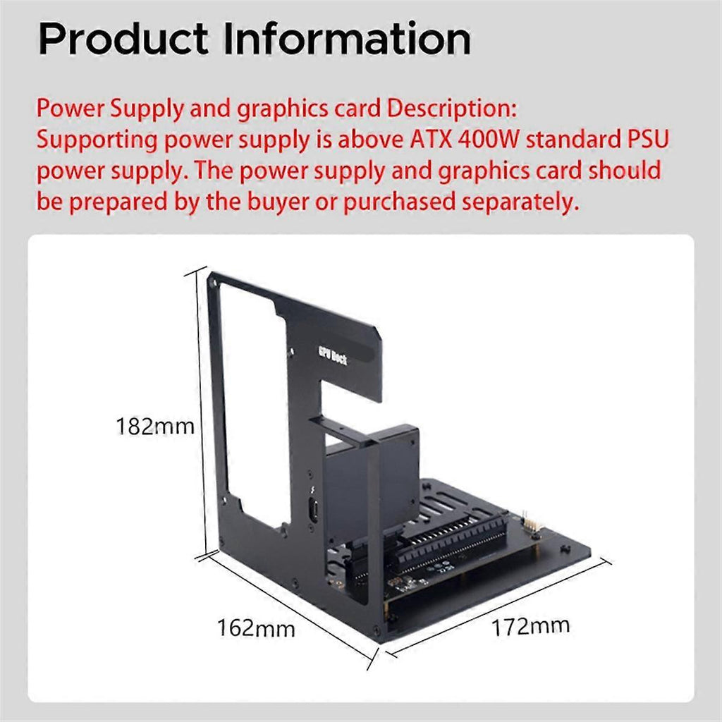 This is an upgraded version of WKGL17C50, compatible with for 's GPU Dock. If your laptop has a compatible 3 or compatible 4 interface, you can use it to connect external graphics for gaming, video editing, image processing, and more. It is equipped with an ATX power socket, making it more convenient to use. Note:It does not support for Macbooks with M1/M2/M3 chips.When you use MacOS for , MacOS does not support version graphics cards. When you use bootcamp to install a Windows system on for , it only supports version graphics cards. Please install the latest version of the W11 system.The WKGL17C50 and WKGL17C100 models do not support the use of MacOS for : 1. Model: WKGL17 2. Compatible with for 3/4 3. Speed: 40Gbps 4. Aluminum alloy shell 5. Size: 182mmx180mmx165mm 6. Weight:600g 7. Power supply: ATX 150mm x 140mm x 86mm 8. Note: Compatible with : up to 5V 3A9. It does not support ports for 1 and for 2 Colour: black Material: PC+metal Note: Due to different product batches, the appearance may be different, which does not affect use. Package Contents: 1*GPU Dock Kit(Cord length: about 100cm) Only the above package content, other products are not included. Note: Light reflection and different displays may cause the color of the item in the picture a little different from the real thing. The measurement allowed error is +/- 1-3cm.