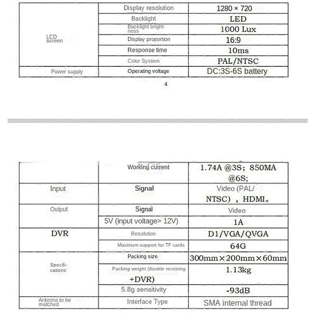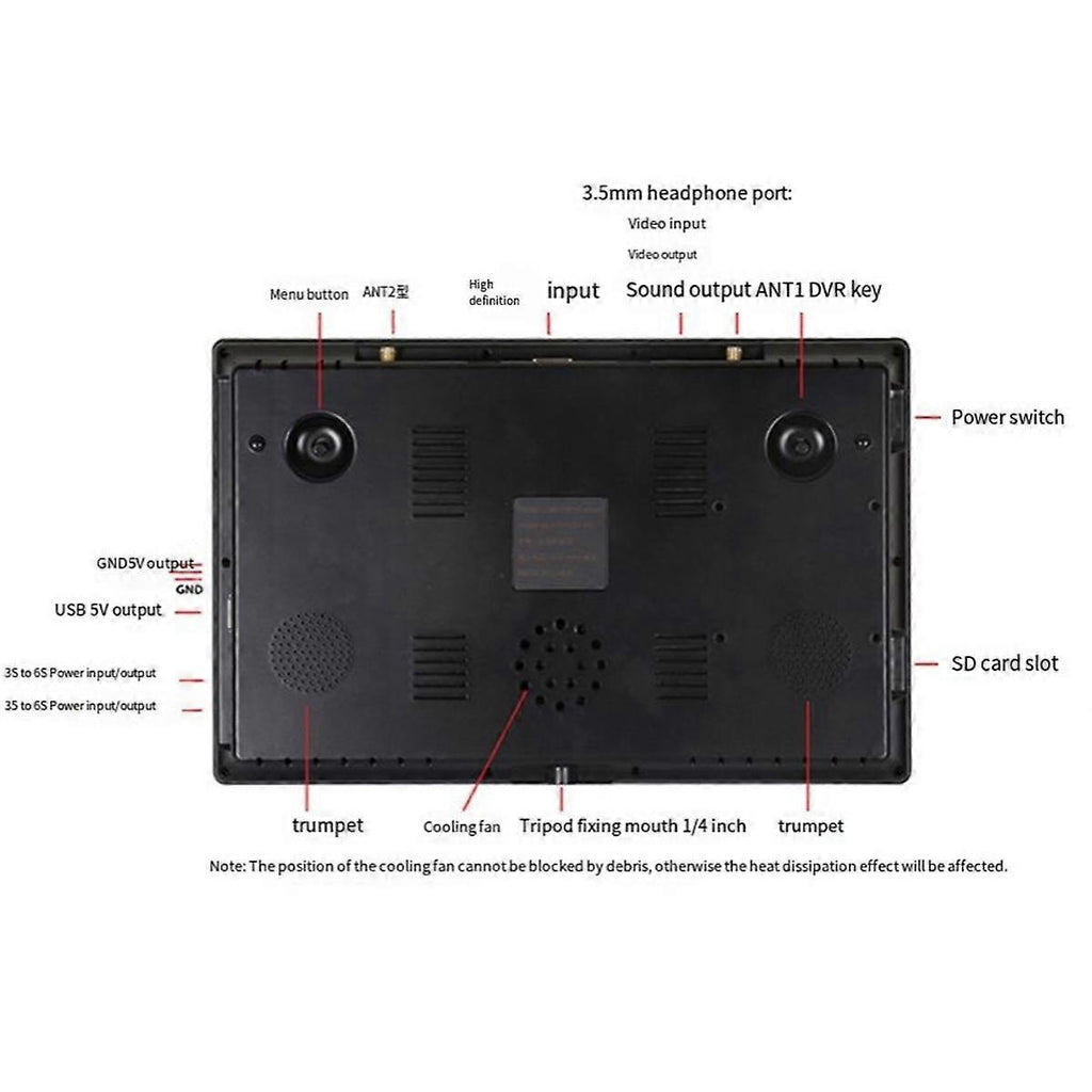 Specially designed for aerial photography system, CAPTAIN monitor High brightness: 1000 . built-in dual receivers. DVR : integrated DVR black box can run in the background for recording. No delay/anti blue screen/anti black screen: the built-in DVR system 't cause any delay in receiving signal; blue screen or black screen will definitely not occur.Auto/manual channel scan: no need for DIP switch.HD-MI input. Backlight LED Backlight brightness 1000 Display ratio 16:9 Response time 10ms Color system PAL/NTSC Power supply working voltage DC: 3S-6S battery Working current 1.0A @3S; 550MA @6S; Resolution /VGA/QVGA Maximum supported TF card 64G Colour:Black Material:plastic Package Contents: 1x monitor 2x stick antenna 1x 3.5mm video cable 1x Bracket 1x XT60 to DC Only the above package content, other products are not included. Note: Light reflection and different displays may cause the color of the item in the picture a little different from the real thing. The measurement allowed error is +/- 1-3cm.