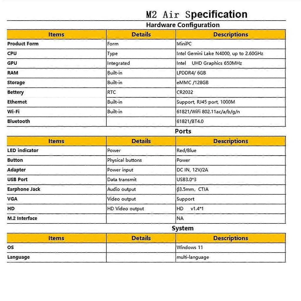 M2 Air Mini PC for N4000 CPU Win11 6GB RAM 128GB ROM Dual-Band WiFi VGA Portable Mini Computer BT4.