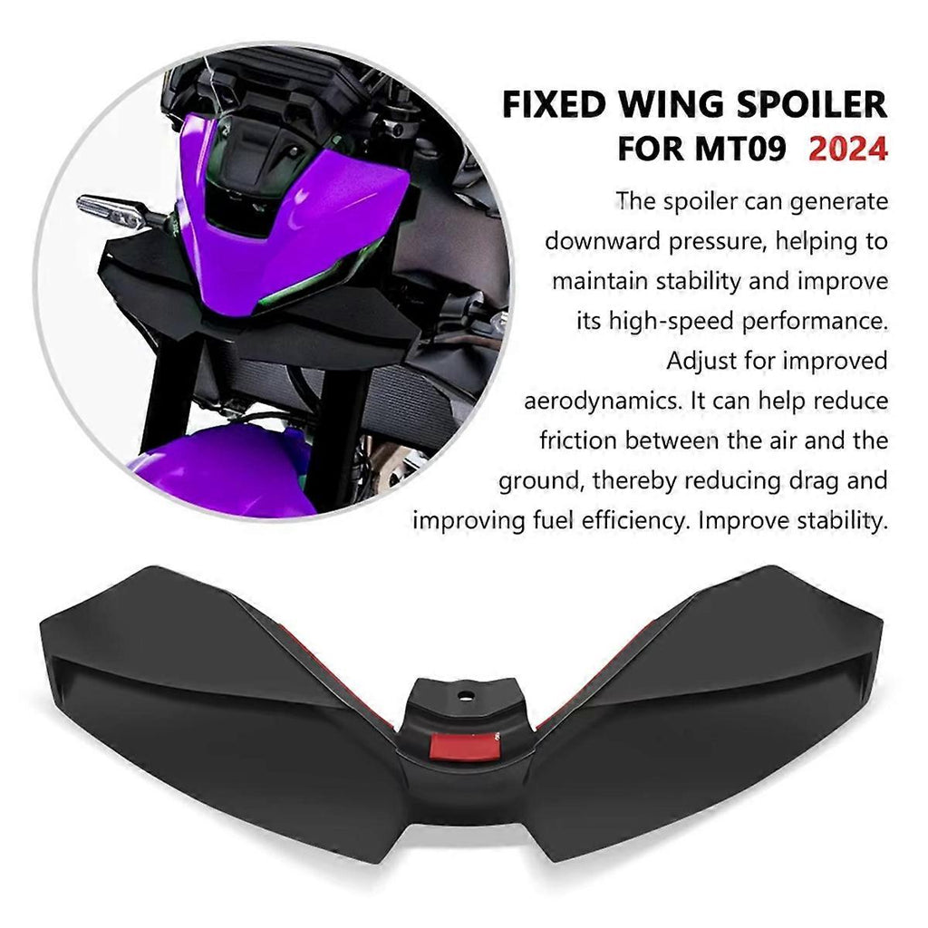 The spoiler can generatedownward pressure, helping tomaintain stability and improveits high-speed performance. By mounting these spoilers you increase the vertical downforce at high speeds, an effect that improve the stability of the bike and reduce the risk of losing control over the front axle. By changing the direction and speed of the air flow, the lift force of the rearof the vehicle is reduced, and the adhesion of the rear wheel is increased,thus improving the high-speed stability and handling performanceof the vehicle. Adjust for improvedaerodynamics. can help reducefriction between the air and theground, thereby reducing drag andimproving fuel efficiency. lmprove stability. Fitment:For MT09 2024 2025 For MT09 SP 2024 2025 Color: black Material: Plastic Package Contents: 1 x Motorcycle Front Spoiler Only the above package content, other products are not included. Note: Light reflection and different displays may cause the color of the item in the picture a little different from the real thing. The measurement allowed error is +/- 1-3cm.