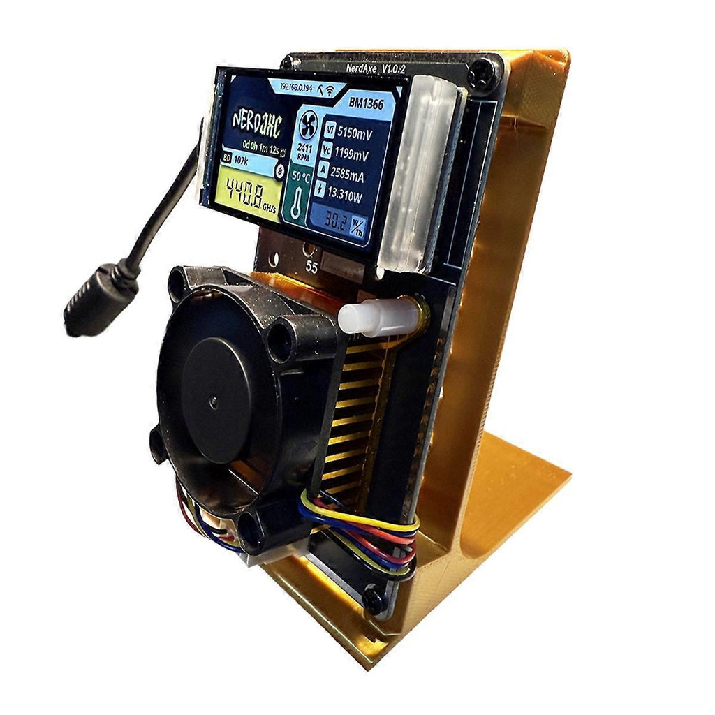 NerdAxe is a fork from bitaxe Ultra with fullcolor display graphics, a fully open-source Bitcoin ASIC miner. NerdAxe is indented to be an expansion board for these who have a NerdMiner and would like to have more powerful mining features without losing the NerdMiner essence. That's why NerdAxe is currently controlled by the common board used on Nerdminer project,This design ensures an efficient and powerful mining capabilities, achieving 500 /s with an energy efficiency of 20 J/TH. Although the current mining capabilities of Nerdaxe position it as a solo miner compatible with any solo mining pool, it's important to manage expectations regarding its performance. Mining a block independently with Nerdaxe is a challenging and unlikely. Due to different batches, there may be differences in product appearance, color, and printed text, and the fan in the product may be labeled, which not affect the use. Plug Type:UK plug,it applies to Malaysia, the United Kingdom and so on. Voltage:AC230V Colour:Gold Material:Plastic+PCB Package Contents: 1 * NerdAxe Miner 1 * Power adapter Only the above package content, other products are not included. Note: Light reflection and different displays may cause the color of the item in the picture a little different from the real thing. The measurement allowed error is +/- 1-3cm.