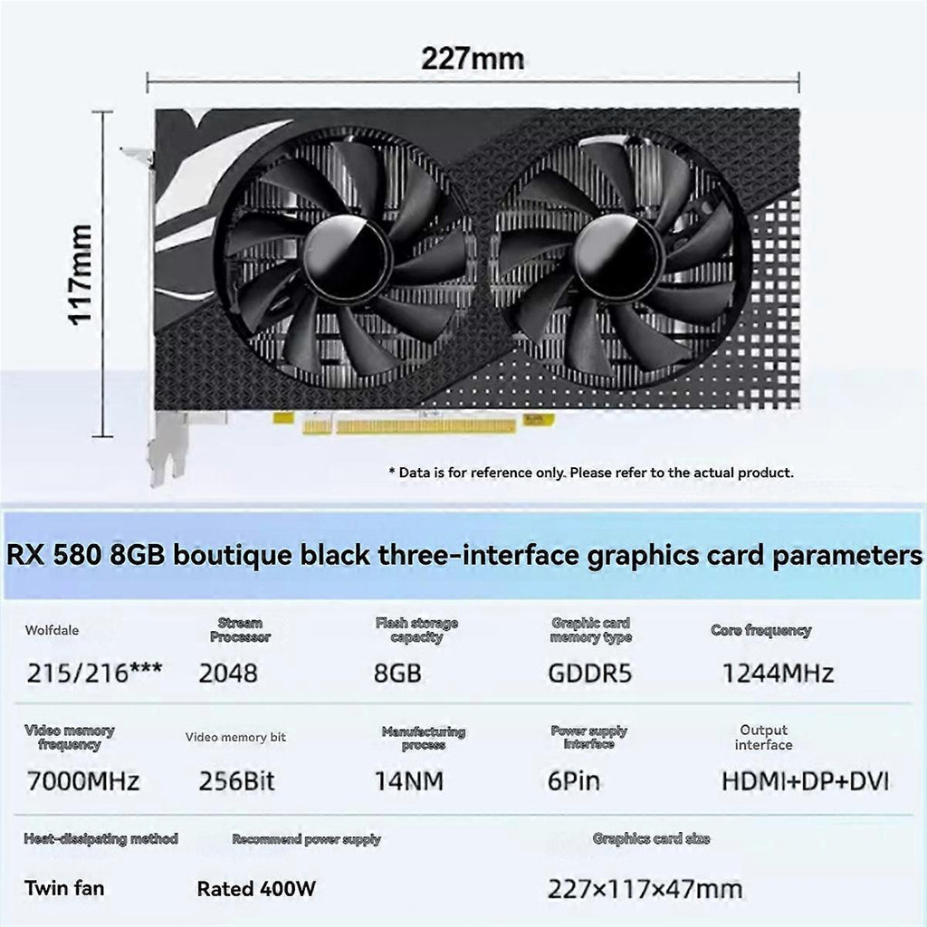 The RX 580 graphics card is designed for high-performance gaming and offers an impressive 8GB of VRAM (Video Random Access Memory). This allows for smooth and immersive gaming experiences. With a core clock speed of 1244MHz, the RX580 delivers fast and responsive performance, ensuring smooth gameplay even in demanding titles. The RX580 8G supports the latest , including HD+DP+DVI Port , enabling users to connect multiple monitors or high-resolution displays for a more immersive gaming experience. Equipped with for AMD's architecture, the radeon RX 580 provides enhanced power efficiency and thermal management. This ensures optimal performance without overheating, even during extended gaming sessions. All RX 580 Graphics Card is from for AMD where you could get a driver download. When installing the driver that comes with the card, you need to uninstall the previous driver software, otherwise it not work. stream processor:2048 Video memory capacity:8GB Video memory type:GDDR5 core frequency:1244MHz Memory frequency:7000MHz Video memory bit width:256Bit Production process:14NM Power supply interface:6Pin Output interface:HD+DP+DVI Heat dissipation method:Dual fans Graphics card size:227x117x47mm Colour: A black Material:ABS Due to different batches, there may be differences in product appearance and printed text, which not affect use Package Contents: 1 * for AMD Cideo Card Only the above package content, other products are not included. Note: Light reflection and different displays may cause the color of the item in the picture a little different from the real thing. The measurement allowed error is +/- 1-3cm.