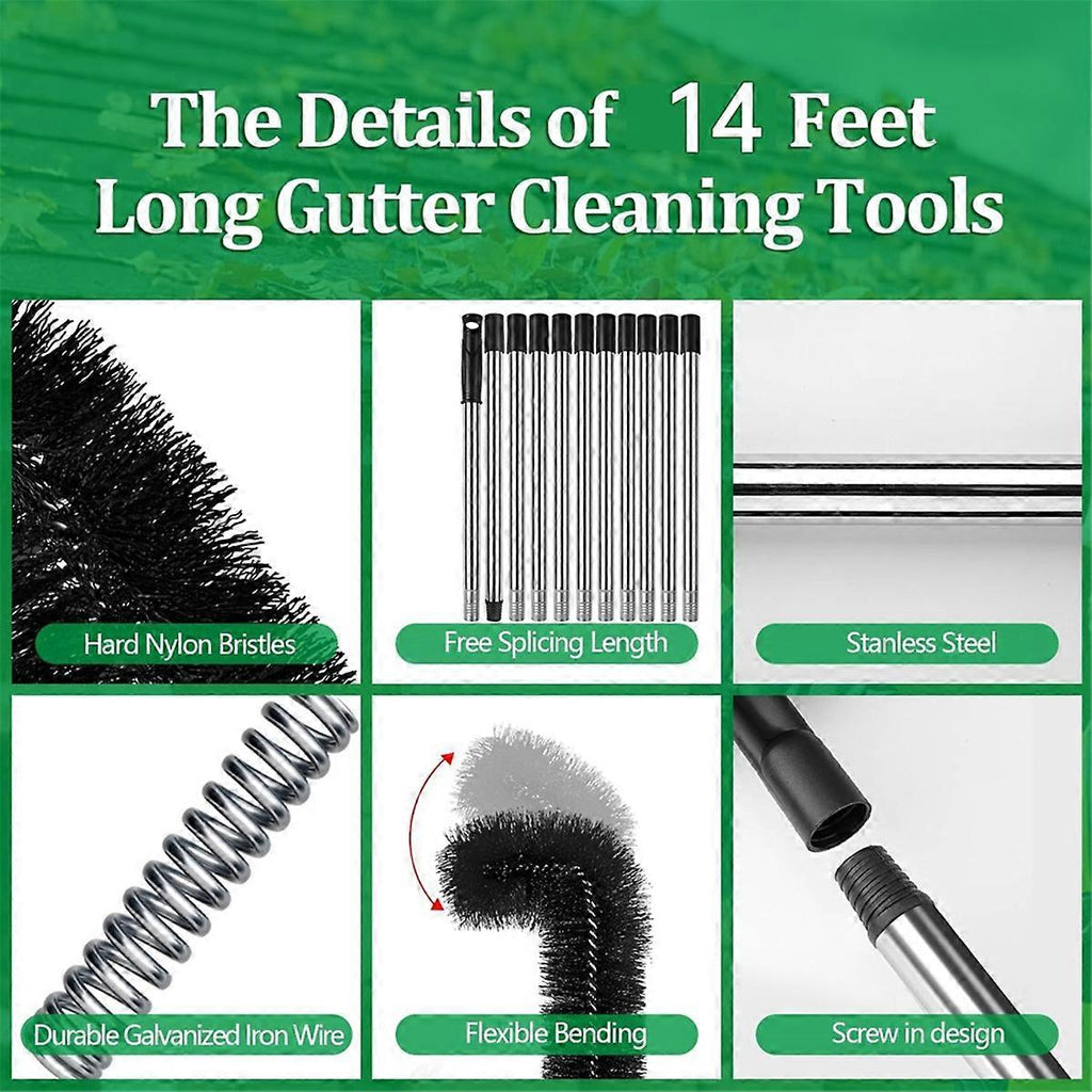[Gutter Cleaning Tools with Fully Accessories] You will receive a set of Gutter Cleaning Tools. Including 11 Stainless steel Material Tubes & 1 Nylon Soft Brush & 1 Nylon Coarse Brush. You are able to clean the gutter from the ground without resorting to dangerous ladders after using it. [Cleanup Tools Optimized for Length and Weight] The Gutter Cleaning Tools maximum length is up to 14ft/430 cm. The length consists of 11 extension tubes, and you are free to combine the lengths as required. It is 4ft/120cm longer than others in its class. [Material upgraded gutter brushes] The Gutter Cleaning Tools are made of Nylon and stainless steel. These materials not only make it tough and durable, but also lighter in weight. These upgrades makes it easier for you to use. [Safer Gutter Brush] We switched to an inline connection that doesn't allow for dangerous scenarios of bolts chipping off. In addition, our longer cleaning brushes can reach higher. Safety is at the core of our tool design. [Multifunctional Gutter Brush] This brush tool allows you to adjust the angle of the brush head (which can be a bit fiddly for sturdiness) for a variety of scenarios. For example, gutters, ceilings, tops of furniture, even under beds or cleaning swimming pools. Please note: the physical slightly color difference or difference, does not affect the use, please do not mind, thank you! Colour:Silver & Black Material:stainless steel Package Contents: 1 set * Gutter Cleaning Tools Only the above package content, other products are not included. Note: Light reflection and different displays may cause the color of the item in the picture a little different from the real thing. The measurement allowed error is +/- 1-3cm.