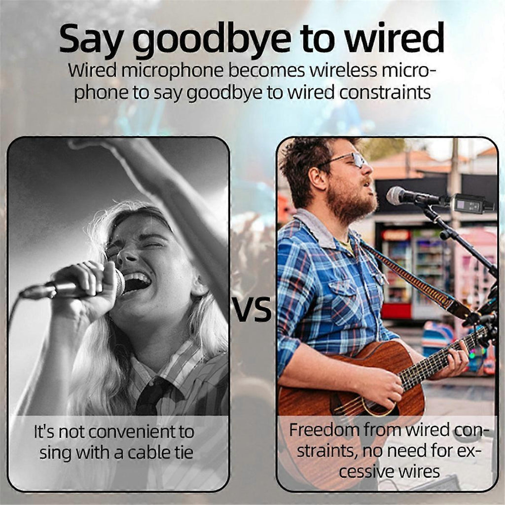 Say Goodbye to Wire, Wire microphone becomes wireless microphone, Freedom from wire contraints , no need for excessive wires. UHF high frequency emission - Equipped with a high-performance transmitter chip, up to 48kHz sampling rate, dynamic range SNR Greater than 110db, accurately restore every detail of the sound, enjoy the dynamic music. 560-590MHZ,16 channels adjustable, Clear sound quality Long-lasting battery - Built-in 1500mah high-capacity battery, using time up to 8-12 hoursic. Fast Charging - Multiple charging types TYPE-C port charging Wide Range of Compatibility: Emitters: 1. Wired microphone 2. 48V microphone 3. musical instruments Refraction: 1. Sound card 2. power amplifier 3. mixing console 4. soundboxes 5. Equipment with microphone jacks This product adopts high integrated chip design, ID code matching authentication Frequency range:560.000-590.000MHz Adjustable channel:16 frequency adjustable points Channel interval:0.5-2.5MHz Modulation mode:Digital modulation Frequency stability:??3PPM Frequency response:40Hz-20KHz Working range:50-80M Operating voltage:Built-in 3.7V, 1500mAh lithium battery Colour:Black Material:Plastic+Metal Package Contents: 1 * Audio Microphone Transmitter 1 * Audio Microphone Receiver Only the above package content, other products are not included. Note: Light reflection and different displays may cause the color of the item in the picture a little different from the real thing. The measurement allowed error is +/- 1-3cm.