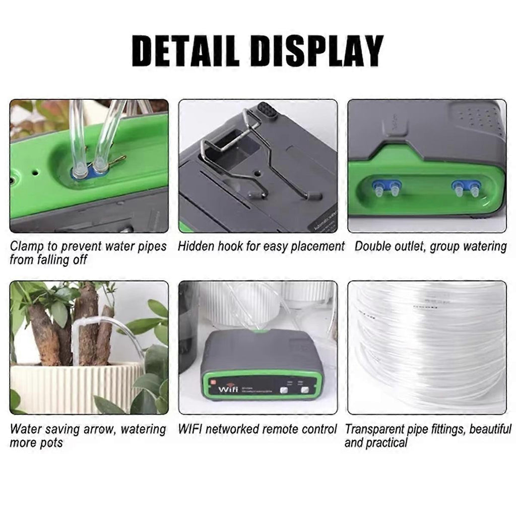 Two timing modes [Interval loop/custom] Custom mode allows multiple programs to coexist, interval mode is limited to one program, custom andinterval modes can coexist, and the total number of programs can be saved up to 10 Protection switch [ Travel with peace of mind] After setting the protection time and turning it on, regardless of manual watering or timed mode, the maximum time is based on the protection time. Water pump pumping [No fixed water source constraints] No need to connect the faucet, the flower watering device combined with a water pump and timer can automatically and regularly pump water from the water storage container to water the flowers- application scenario:home gardening type: Drip irrigation series Color: Gray + Green Material: Plastic Package Contents: 1 x Watering Machine set Only the above package content, other products are not included. Note: Light reflection and different displays may cause the color of the item in the picture a little different from the real thing. The measurement allowed error is +/- 1-3cm.