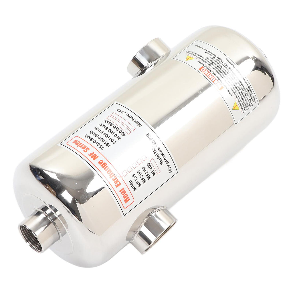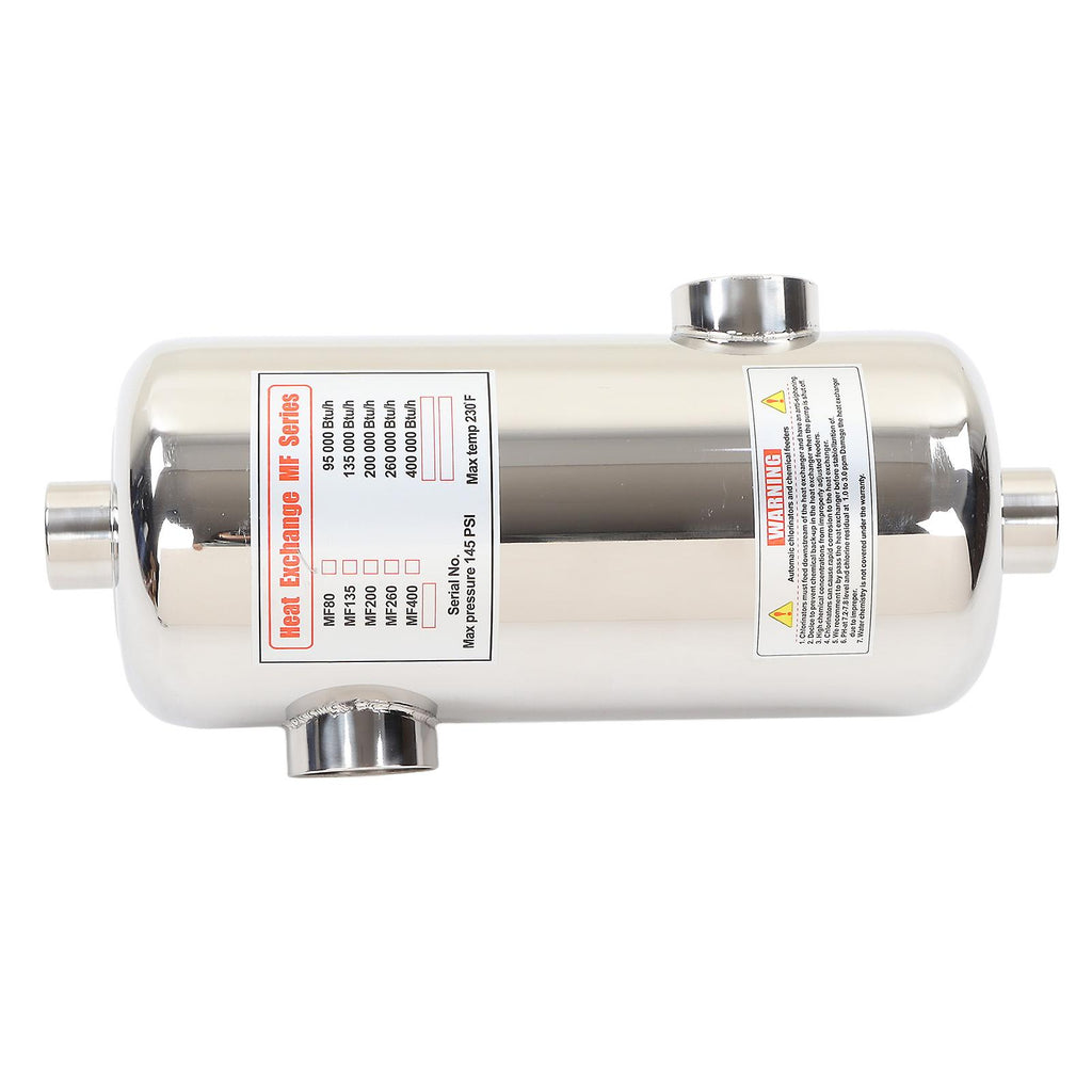 Features 1??Stainless Steel Material: The swimming pool heat exchanger is made of high grade anti corrosion stainless steel, anti rust and salt water resistance, durable. 2??Constant Temperature: It is heated by water, and the cold water is turned into hot water by heat energy, which is heated circularly. It is suitable for the simultaneous use of solar panels (shipped without solar panels). 3??Maximum Heat Exchange: Specially designed built in flow limiter aims to minimize the pressure loss in the heating system and ensure maximum heat exchange. 4??Space Save: Equipped with stainless steel fixed bracket, easy to install and use. Small and compact size, light weight. Minimum installation space is required. 5??Application: The heat recovery pool heater is suitable for swimming pools, spas, hot tubs, solar, hydraulic heating, oil cooling, heat recovery, snow melting, etc. Specifications Item Type: Pool Heat Exchanger Material: Stainless Steel Weight: Approx. 2837g/100.07oz Size: 34.2x15.7cm/13.46x6.18in Specifications: 40KW Note: Does not contain electricity Side Thread: Female Thread 45mm/1.77in Front and Rear Thread: Female Thread 32mm/1.26in Maximum Operating Temperature: 230?H (110??) Purpose: Suitable for all types of swimming pools, spas and hot pools and spas Type of Heat Exchanger: MF 135 Application Scenario: swimming pool, hot spring, hot tub Swimming Pool Area: 12000 Gallon, Temperature required to rise 1 ?H/h: 100098 btu/h; Temperature required to rise 2 ?H/h: 100098 Swimming Pool Area: 14000 Gallon, Temperature required to rise 1 ?H/h: 116781 btu/h; Temperature required to rise 2 ?H/h: 133464 Swimming Pool Area: 16000 Gallon, Temperature required to rise 1 ?H/h: 133464 btu/h Package List 4 x Part 1 x Heat Exchanger 1 x Instruction