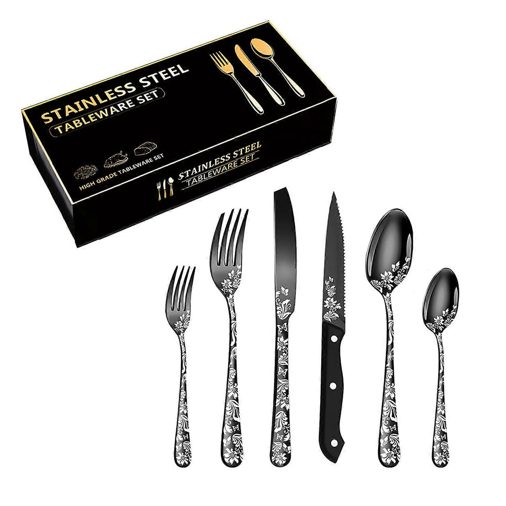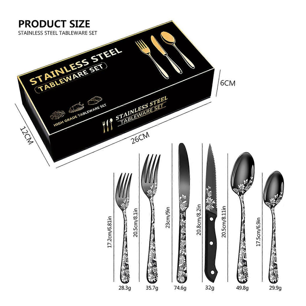 Features 1??48PCS one set, includes 8 steak knives, 8 dinner knives, 8 dinner forks, 8 dinner spoons, 8 tea forks, and 8 teaspoons, service for 8 people, used for eating rice, pasta, steak, dessert, soup, fried food, etc. 2??A multifunctional dining silverware set for daily use, camping, parties, birthday, wedding, and more, suitable for home, restaurants, hotels, etc. 3??Well made of high-quality stainless steel, no chemical smells, rust-proof and corrosion-resistant, sturdy and for long-time service. Features: 48PCS one set, includes 8 steak knives, 8 dinner knives, 8 dinner forks, 8 dinner spoons, 8 tea forks, and 8 teaspoons, service for 8 people, used for eating rice, pasta, steak, dessert, soup, fried food, etc. A multifunctional dining silverware set for daily use, camping, parties, birthday, wedding, and more, suitable for home, restaurants, hotels, etc. Well made of high-quality stainless steel, no chemical smells, rust-proof and corrosion-resistant, sturdy and for long-time service. With special beautiful pattern and mirror-polished surface, not easy to fade, always keeps shiny, good-looking and generous, a nice gift for friends and families. Light weight design, easy to carry, suitable for indoor and outdoor use; easy to wash clean with water, also safe for using a dishwasher. Specifications?? Color: Silver, gold, rose gold, multicolor, black (optional) Material: Stainless steel Steak Knife Size: 20.8cm/ 8.2inch Steak Knife Weight: 32g/ 1.1oz Dinner Knife Size: 23cm/9inch Dinner Knife Weight: 74.6g/ 2.6oz Dinner Fork Size: 20.5cm/ 8.1inch Dinner Fork Weight: 35.7g/ 1.2oz Dinner Spoon Size: 20.5cm/ 8.1inch Dinner Spoon Weight: 49.8g/ 1.7oz Tea Fork Size: 17.2cm/ 6.8inch Tea Forks Weight: 28.3g/ 0.9oz Teaspoon Size: 17.5cm/ 6.9inch Teaspoon Weight: 29.9g/ 1.05oz Note?? The plates and placemats showed in the pictures are not included. Package List?? 8 * Steak Knife 8 * Dinner Knife 8 * Dinner Fork 8 * Dinner Spoon 8 * Tea Fork 8 * Teaspoon Package List 8 * Steak Knife 8 * Dinner Knife 8 * Dinner Fork 8 * Dinner Spoon 8 * Tea Fork 8 * Teaspoon
