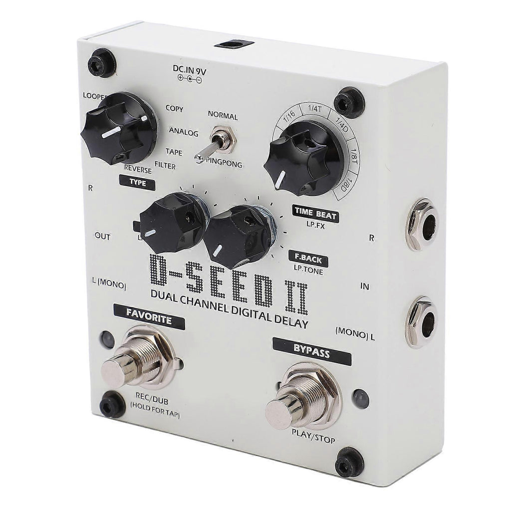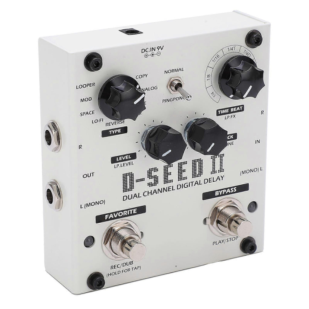 Features 1??The delay effect has 8 different types of delays, the longest support delay time of 2000MS. 2??Has toggle switch to superimpose the stereo PingPong effect for the delay, each delay can turn on the PingPong mode. 3??With LOOPER function, 6.35mm mono socket input and output, playback can add tape recording simulation effect. 4??Delay effect has Tap Tempo function, you can set the delay time, and support FAVORITE function. 5??The delay effect is equipped with LED lights to display various mode states and is easy to operate. Specification Item Type: Delay Effect Material: Metal Color: White L R Input: 6.35mm mono socket L R Output: 6.35mm mono socket Input Impedance: 2.2M?? Output Impedance: 100?? Power Supply: DC 9V(external positive and internal negative) (not including adapter) Working Current: 220mA Package List 1 x Delay Effect 1 x User Manual