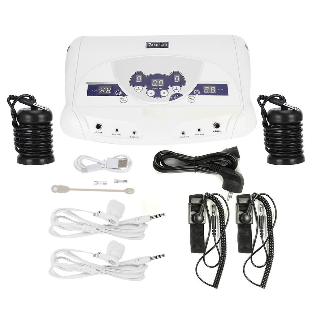 Features 1??The machine release a large number of energy ions, and these active energy ions penetrate into the body to supplement the lack of negative ions in the body. 2??Eliminate fatigue and improve immunity, remove toxins, deep conditioning, and improve sub?health. 3??Promote edema regression, improve alveolar ventilation function, improve blood oxygen saturation, promote asthma patients and other lung function and alveolar secretion function to return to normal. 4??Through the activation of cells to promote the metabolism, eliminate waste, harmful substances, eliminate blood pollution, maintain the purification of blood. 5??Ion has the direct function of inhibiting serum cholesterol, reducing blood fat and incidence of atherosclerosis. 6??Anion can adjust the function of the plant nervous system, and adjust the it to the best balance state, to achieve the purpose of disease prevention and treatment. 7??Improve respiratory and food allergies by adjusting the balance of the vegetative nervous system and increasing resistance to allergens. Specification Condition: Item Type: Foot Spa Machine Power: 60W Frequency: 50Hz/60Hz Output Current: 0-2.5A Package List 1 x Host 2 x Ion Head 2 x Headset 1 x USB Cable 1 x Power Cord 2 x Fuse 1 x Manual 1 x Spoon 2 x Wrist Band