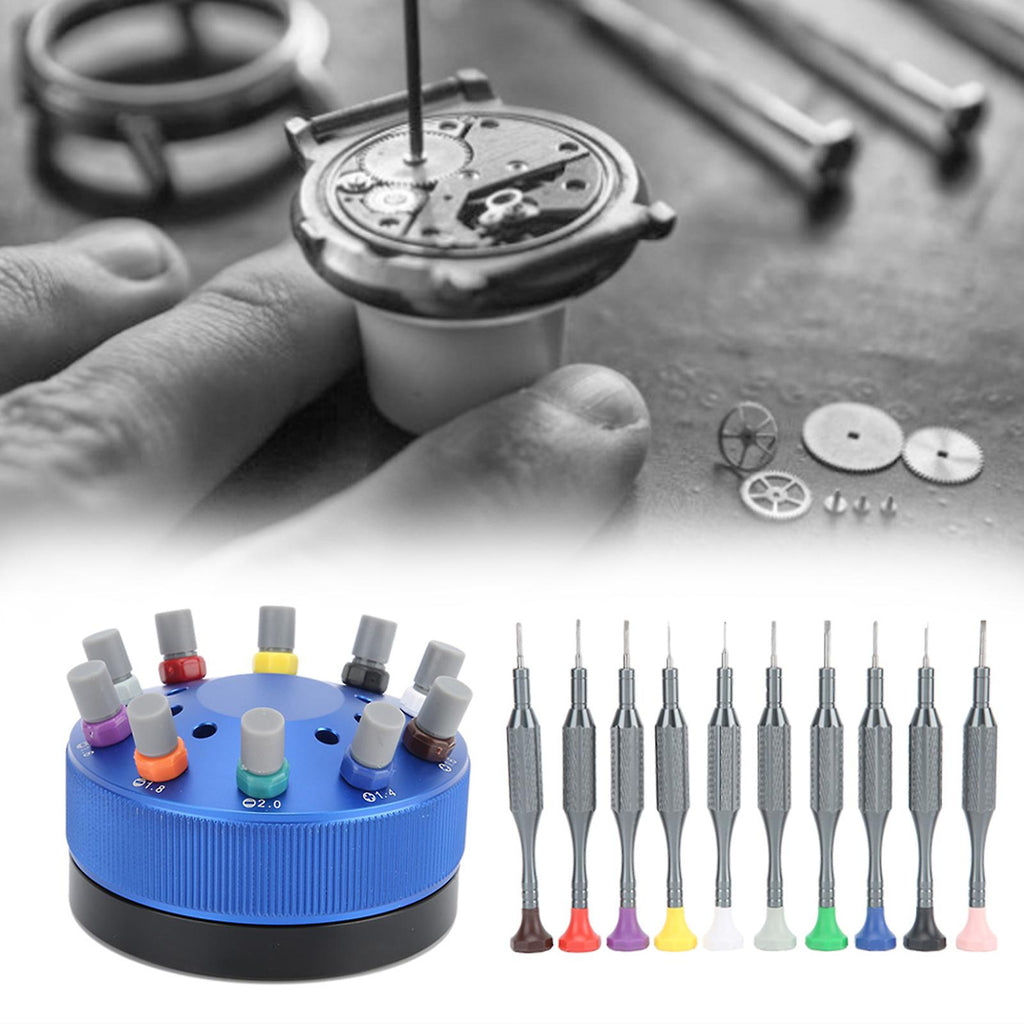 Features 1??Made of quality metal material, durable and sturdy, having long service time. 2??Professional watch repairing tool, with 10 different type of screwdrivers. 3??Suitable for watch repairing and mobile phone, laptop disassembly. 4??The base helps you hold these screwdrivers easily, space-saving and tidy. 5??Equipped with 10 replaced heads, can meet your different your needs. 6??Professional repairing tools for watchmakers and watch repairing workers. Specification Condition: Item Type: Watch Screwdriver Material: Metal Screwdriver Type: Slot Type(mm): 0.6, 0.8, 1.0, 1.2, 1.4, 1.6, 1.8, 2.0 Cross Type(mm): 1.4, 1.6 Package List 10 x Screwdriver 10 x Spare Screwdriver Head 1 x Base