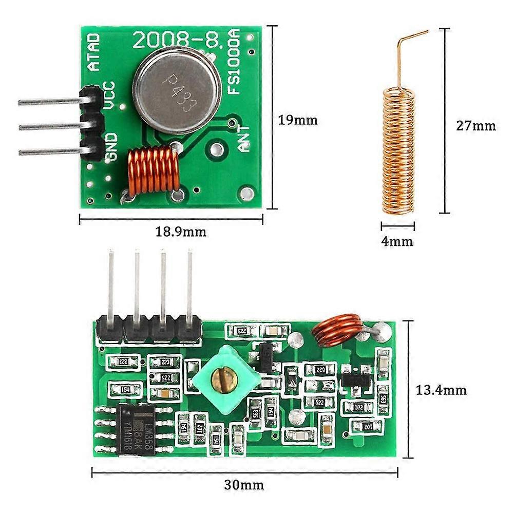 [How to use it]The VCC voltage must match the working voltage of the module and remain in good performance filtering. Perfect kit: This kit contains 3 pairs of transmitter and receiver modules as well as 3 pairs of antenna helical spiral spring remote control. And the frequency is 433 MHz. It is very popular for remote control systems such as roller gates with remote control, smart car, smart home, etc. [Easy to use]Great influence on receiving the antenna module, preferably connected to the 1/4 wavelength of the antenna, typically 50 Ohm inductor. The length of the antenna is . 17 cm. Wireless transmitter modules: allow for your to communicate wirelessly with others for or high-frequency controlled devices that work at the same frequency (in this case 433 MHz). Warm tips: The antenna position also has the reception of the module, the installation, the antenna as directly as possible by the shielding, the high pressure and the interference source. The frequency used for receiving, decoding and oscillation resistance should match the transmitter. Colour: green Material: plastic + metal Package Contents: 3 x 433 MHz wireless transmitter module 3 x 433MHz wireless receiver module 6 x 433 MHz coil spring antenna Only the above package content, other products are not included. Note: Light and different displays may cause the color of the item in the picture a little different from the real thing. The measurement allowed error is +/- 1-3cm.