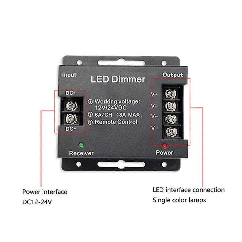 RF wireless touch remote control Adjustable light brightness. static color With power-off storage function Short circuit protection:automatic recovery. custom settings:Control a light that uses an LED as a light source and passes a resistive current through it, such as a monochromatic light bar, etc. Practical Application: Interior decoration:clubs, corridors, rooms, living rooms, museums, etc. Outdoor decoration:commercial buildings, entertainment clubs, night lighting, etc. Name:18A LED Monochrome Controller Application:Monochromatic LED Control method:RF touch remote(Not included batteries) Power Suplly:2 AAA batteries(Not included batteries) Input voltage:12V-24V Output power:5V less than equal 90W; 12V less than equal 216W; 24V less than equal 432W Static power consumption:Less than 1W Output current:max 18A Working temperature:-20-60?? Connection method:common anode Colour:As Shown Material:plastic+Metal Size: Controller size:L82xW81xH31mm Remote control size:L113xW55xH15mm Package Contents: 1 * 18A LED Monochrome Controller Kit Only the above package content, other products are not included. Note: Light reflection and different displays may cause the color of the item in the picture a little different from the real thing. The measurement allowed error is +/- 1-3cm.