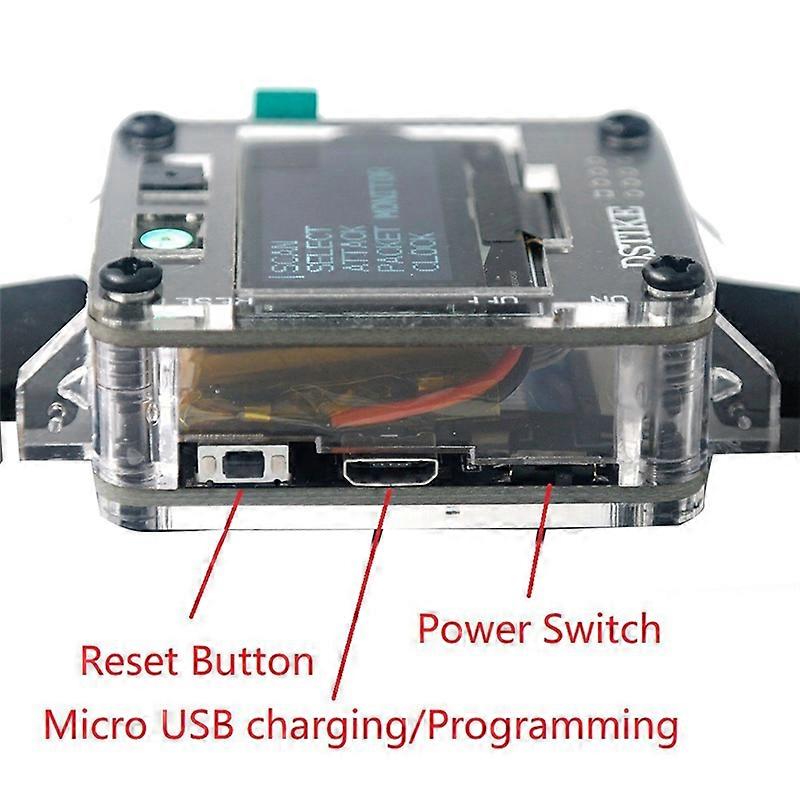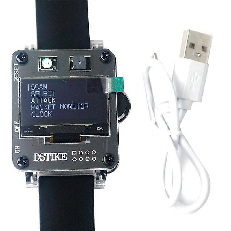 Deauther Attack: Disconnect 2.4G WiFi Deauther Beacon: Create fake networks Deauther Probe:Confuse wifi trackers Packet Monitor:Display wifi traffic Display: SH1106 1.3inch OLED Display SDA: GPIO 5 Display SCL/: GPIO 4 WS2812b LED: GPIO 15 Button Up: GPIO 12 Button Down: GPIO 13 Button Select: GPIO 14 Buzzer: GPIO 0 Side Button: Colour:black Material:ABS Package Contents: 1 x Deauther Watch 1 x USB Cable Only the above package content, other products are not included. Note: Light reflection and different displays may cause the color of the item in the picture a little different from the real thing. The measurement allowed error is +/- 1-3cm.