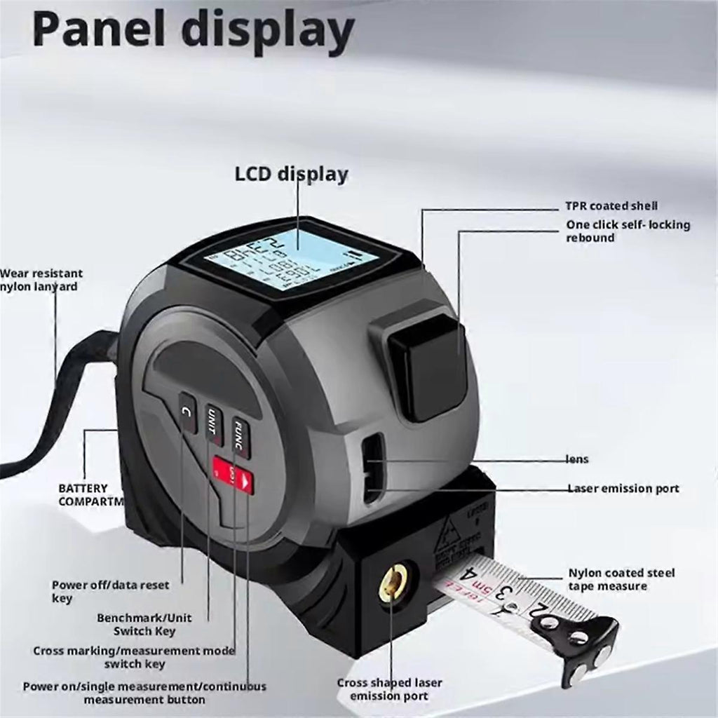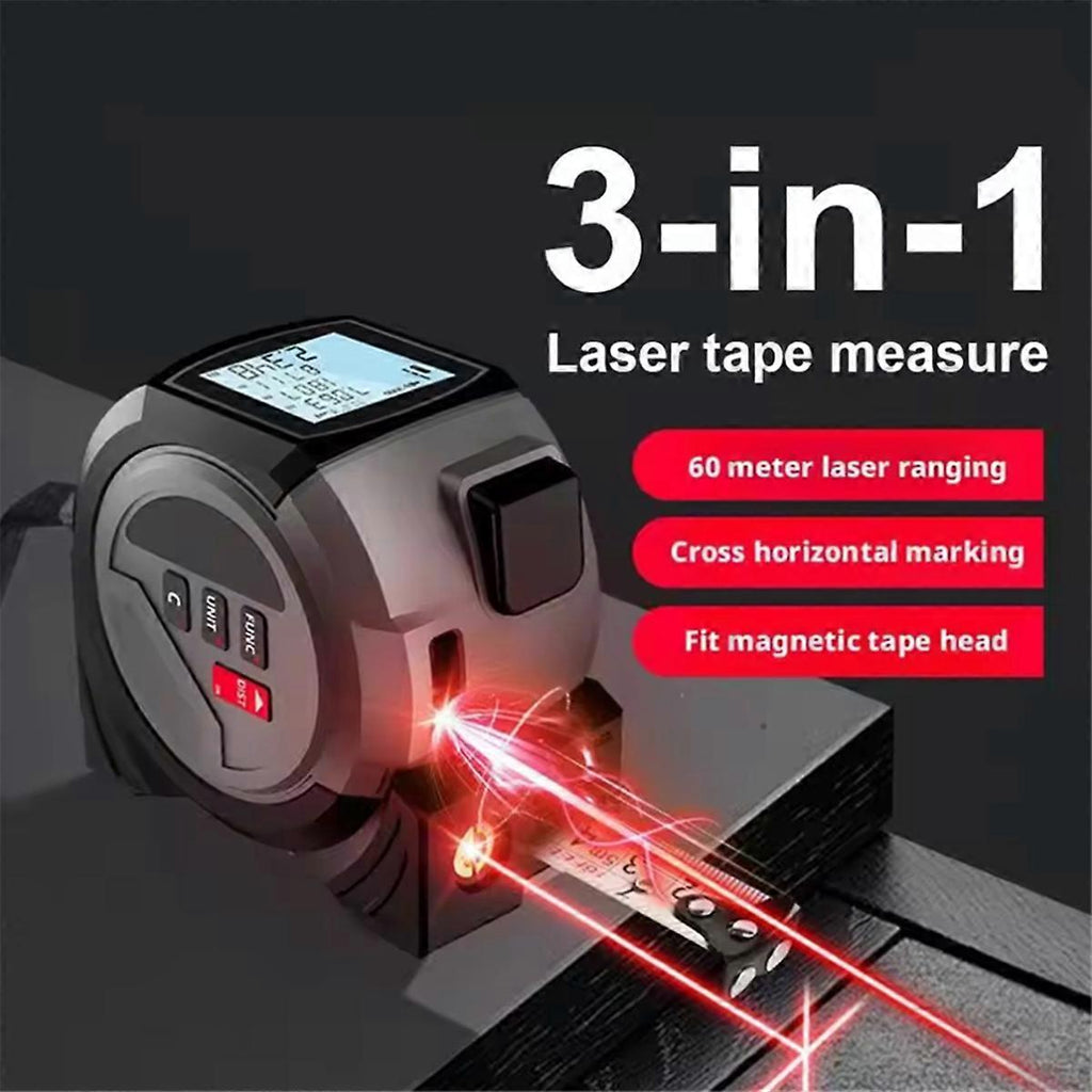 High-Precision Tape Measure: This innovative tool combines three functions in one: measurement, crosshair level, and magnetic absorption. It offers precise measurements up to 60 meters with high accuracy. Versatile Usage: Ideal for applications such as construction, home improvement, and professional use. The magnetic base allows for easy attachment to metal surfaces, making it convenient for hands-free operation. User-Friendly Design: Equipped with a clear LCD display and simple button controls, this tape measure is easy to use even for beginners. The design ensures and reliability. Compact and Portable: and compact, it fits easily into your pocket or tool belt. The ergonomic design provides a comfortable grip, making it suitable for extended use. Name:3-in-1 Measuring Tape Measuring distance:0.05M-60M Measuring accuracy:2mm Measuring Function:5m tape measure/special waist back buckle/nylon lanyard Colour:As Shown Material:Stainless Steel + ABS + Package Contents: 1 * Laser measuring tape Only the above package content, other products are not included. Note: Light reflection and different displays may cause the color of the item in the picture a little different from the real thing. The measurement allowed error is +/- 1-3cm.