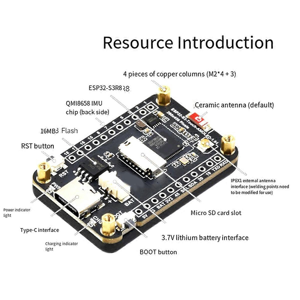Equipped with high-performance Xtensa 32-bit LX7 dual-core processor, with a main frequency of up to 240MHz. Supports 2.4GHz Wi-Fi and Bluetooth 5 (LE), onboard internal antenna, reserved solder joints, can be set as external antenna. Built-in 512KB and 384KB ROM, stacked with 16MB Flash and 8MB PSRAM. Onboard 1.64-inch AMOLED capacitive touch screen, 280x456 resolution, 16.7M colors. AMOLED screen display uses QSPI interface, capacitive touch uses I2C interface. Onboard QM18658 six- inertial measurement unit (3- acceleration, 3- gyroscope) can detect motion posture, step counting, etc. Onboard , BOOT side buttons, BOOT supports custom button functions, making development and use more flexible. Onboard 3.7V MX1.25 lithium battery charging and discharging interface. Onboard Micro-SD card slot, can be connected to an external SD card to store pictures or files. Onboard USB Type-C interface, can be used for power supply and download debugging, convenient for development and use. Exposed I2C, UART and USB pins for external devices and debugging, flexible configuration of peripheral functions. The screen adopts CNC processing structure and edge bonding, with delicate and soft texture, and the overall appearance is beautiful and . (The product appearance and printed words depending on the batch, but this does not affect use) Color: As Shown Material: PCB+LCD Package Contents: 1 * 1.64-inch Touch Screen Only the above package content, other products are not included. Note: Light reflection and different displays may cause the color of the item in the picture a little different from the real thing. The measurement allowed error is +/- 1-3cm.