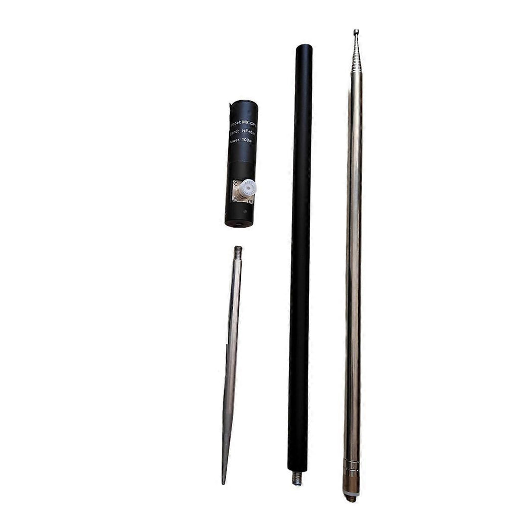 Suitable for 20m-6m band, high efficiency natural tuning. The antenna is scalable and can be applied to 14-50MHz by adjusting the length of the antenna. There are four holes at the bottom for inserting the ground cable into the banana plug. The antenna is mounted by fixing the ground nail. Frequency range: 20m-6m band Power: 100W RF interface: M connector Interface of ground nail and rod antenna: M10 Please note: There may be slight color difference or discrepancy in the actual product, which does not affect the use, please don't mind, thank you! Color: As shown Material: Metal Package Contents: 1 x Portable Shortwave Antenna kit Only the above package content, other products are not included. Note: Light reflection and different displays may cause the color of the item in the picture a little different from the real thing. The measurement allowed error is +/- 1-3cm.
