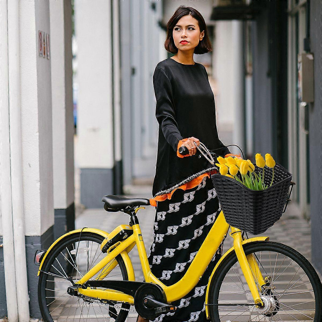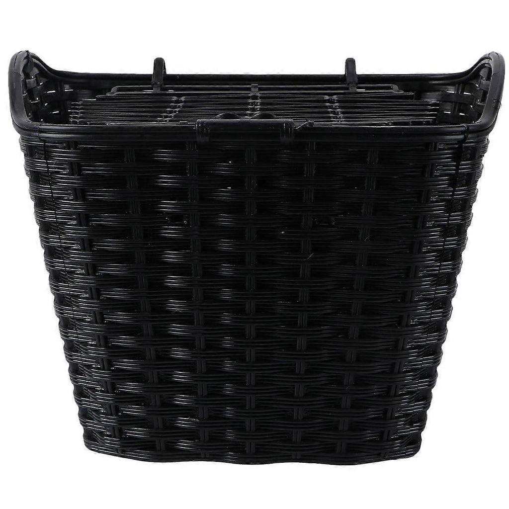 1Pc Electric Bike Plastic Basket Imitated Rattan Woven Basket With Cover Car Basket(Black)